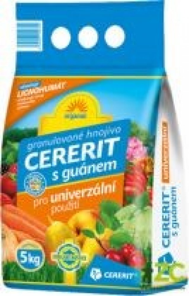 CERERIT S GUÁNEM je organominerální granulované hnojivo se stopovými prvky, určené k výživě ovoce, zeleniny a okrasných rostlin. Výrobek obsahuje minimálně 60% originálního hnojiva CERERIT GSH NPK 8-13-11.