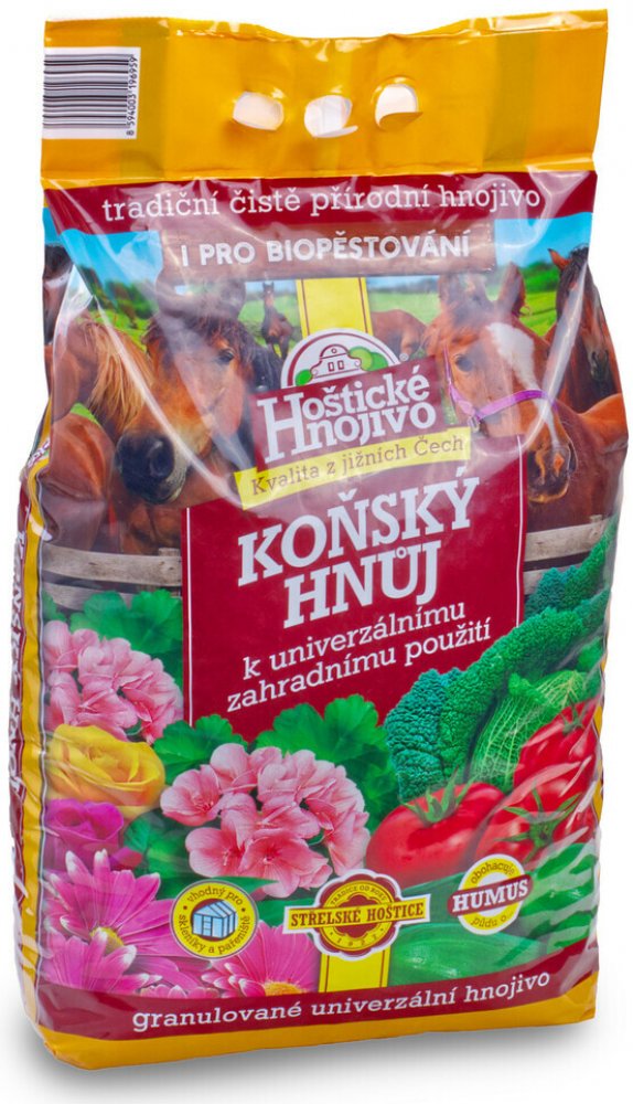 Hoštický koňský hnůj granulovaný je přírodní surovina vhodná pro široké použití v zahradě. Vzhledem ke svému složení je zvláště vhodný k vyhnojení pařenišť a skleníků, lze jej však použít i na záhony. Jeho předností je zhodnocení půdy obohacením o humus a tím vytváření příznivých podmínek pro rozvoj kořenového systému rostlin.