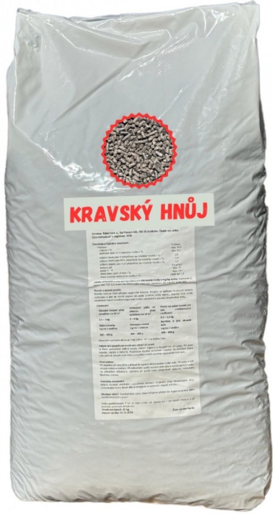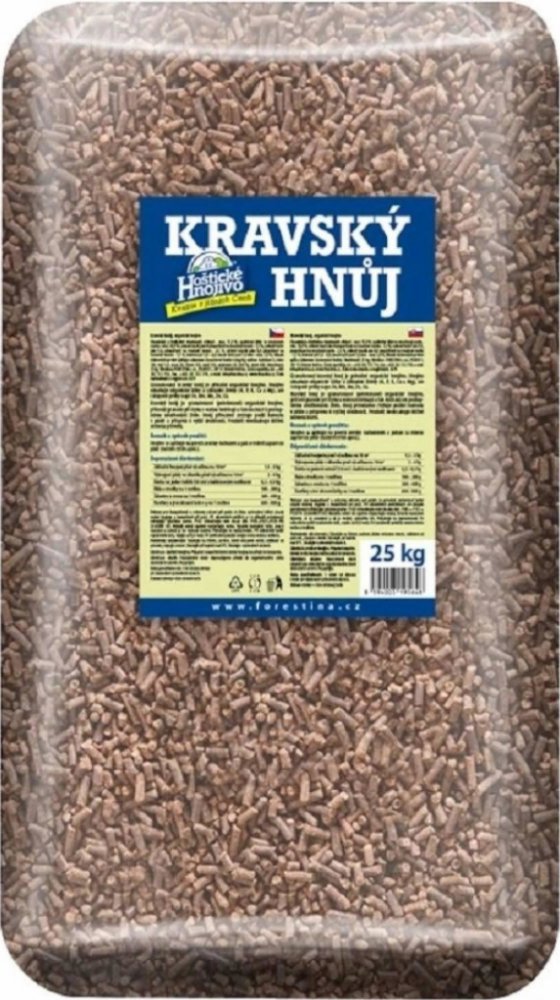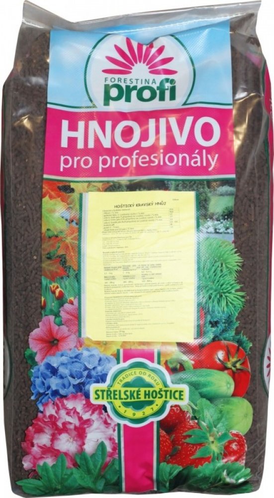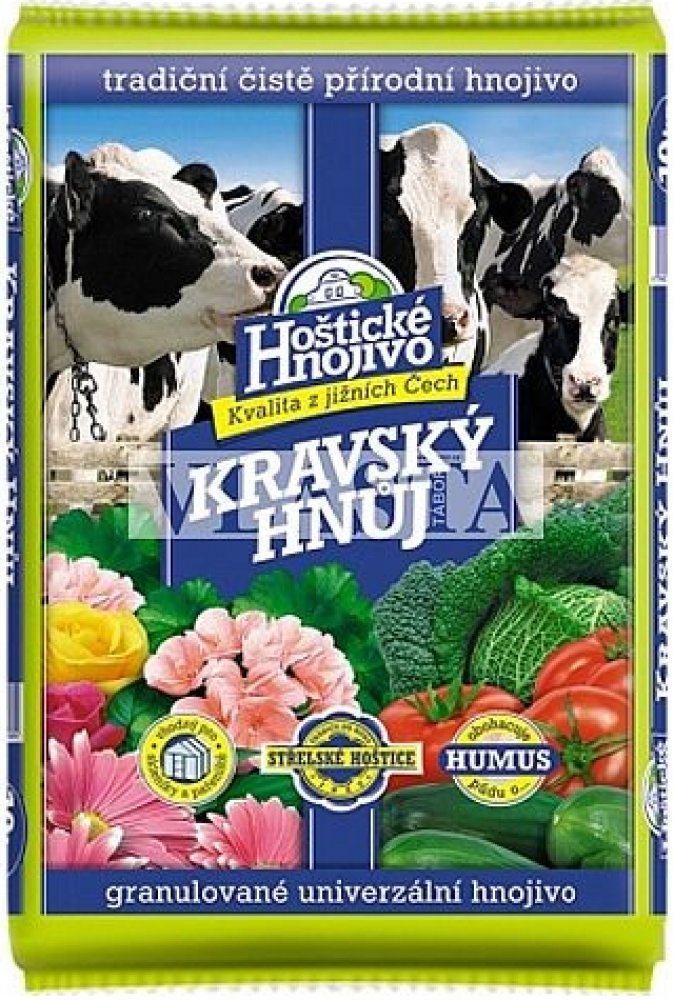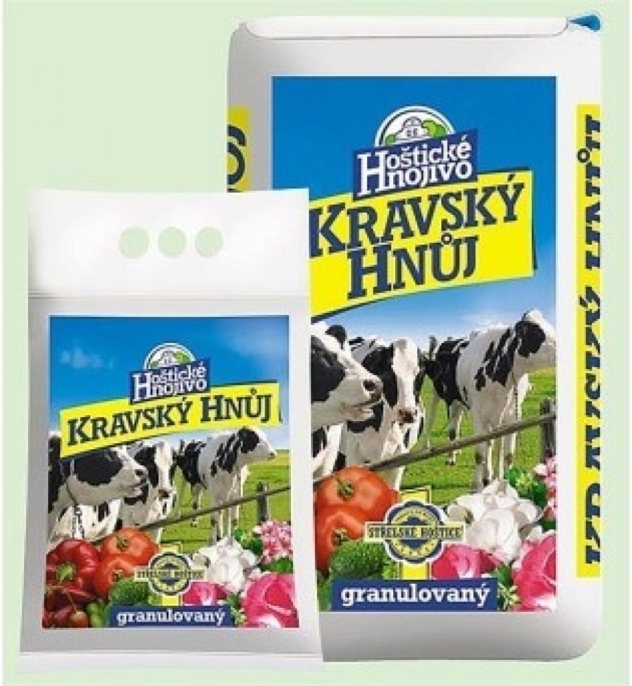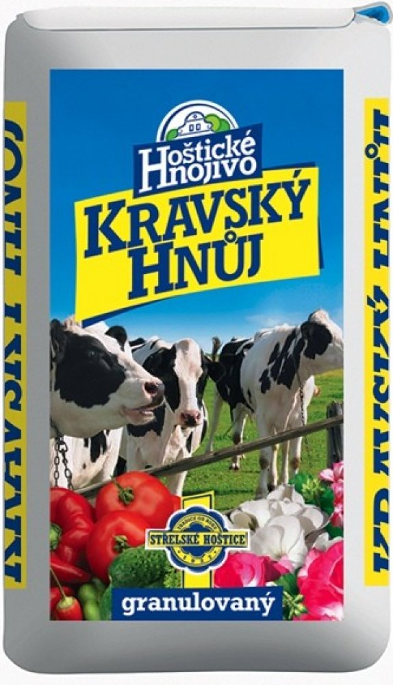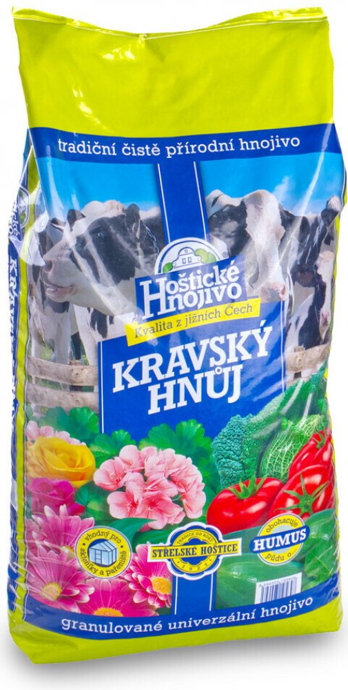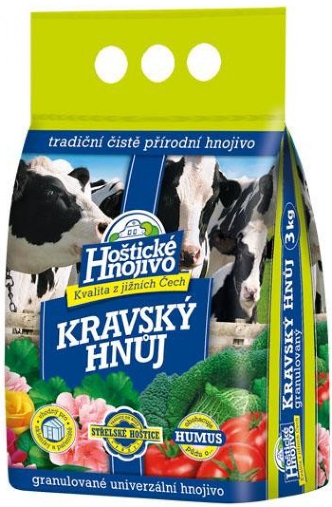 složení: N 1,5 %, P 2,5 %, K 3 %Hoštický kravský hnůj je granulovaný, přičemž granule při styku s vodou bobtnají a tak dochází k postupnému uvolňování živin.Hoštický kravský hnůj se obzvláště hodí ke hnojení zeleniny např. celeru, kapusty zelí, květáku, plodové zeleniny ( rajče, paprika, okurek, apod.), ale i okrasných zahradních rostlin.Dávkování: