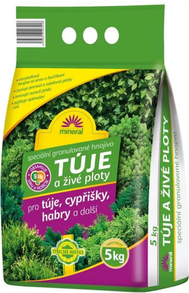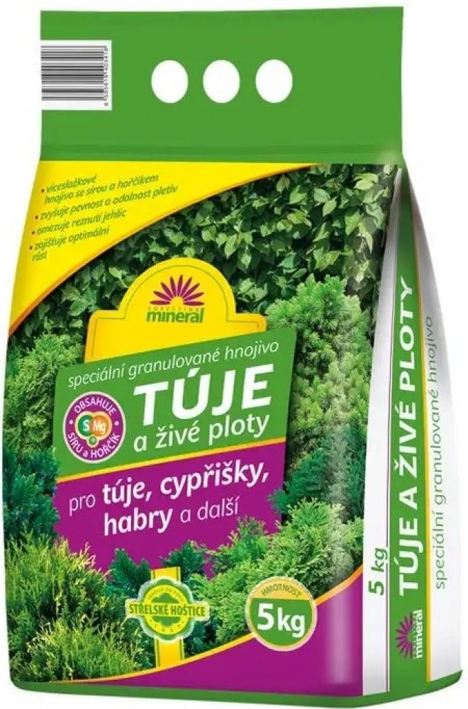Hnojivo na túje a živé ploty je speciální směsné granulované vícesložkové NPK hnojivo s hořčíkem a sírou. Hnojivo je vhodné k výživě živých plotů z tújí, cyprišků, habrů apod.