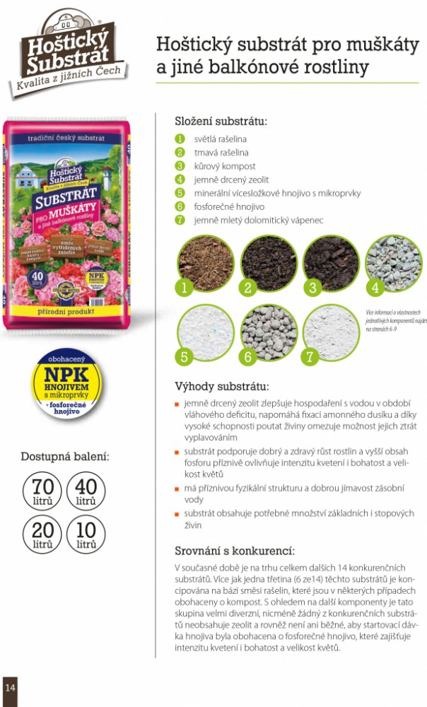 Substrát je vyroben ze směsi vytříděné světlé a tmavé rašeliny, dobře vyzrálého jemně tříděného kůrového kompostu a jemně drceného zeolitu. K základnímu vyhnojení substrátu je použito minerální vícesložkového hnojiva s mikroprvky. Substrát je dále obohacen o fosforečné hnojivo. Půdní reakce je upravena jemně mletým dolomitickým vápencem. Jemně drcený zeolit zlepšuje hospodaření s vodou v období vláhového deficitu, napomáhá fixaci amonného dusíku a díky vysoké schopnosti poutat živiny omezuje možnost jejich ztrát vyplavováním. Podporuje dobrý a zdravý růst rostlin a vyšší obsah fosforu příznivě ovlivňuje intenzitu kvetení i bohatost a velikost květu. Má příznivou fyzikální strukturu a dobrou jímavost zásobní vody, obsahuje potřebné množství základních i stopových živin.