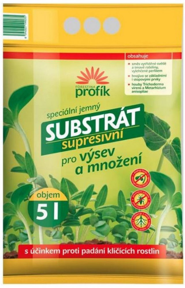 Supresivní výsevní substrát je určen speciálně pro výsevy a množení rostlin. Je připraven ze směsi vytříděné světlé a tmavé rašeliny s upravenou pH reakcí a perlitem. Je vhodný jak k setí semen, tak i k přepichování řízků rostlin. Substrát je obohacen hnojivem se základními i stopovými živinami v nezbytném rozsahu, což má příznivý vliv na bezproblémové zakořeňování řízků a klíčení výsevů.
