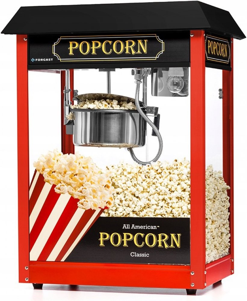 Popcornovač s černou stříškou od společnosti Forgast. Stroj se vyznačuje odolnou a robustní konstrukcí. Dvířka jsou vyrobena z akrylu, ostatní strany jsou z tvrzeného skla. Nádoba z nerezové oceli s teflonovým povrchem uvnitř. Termostat.