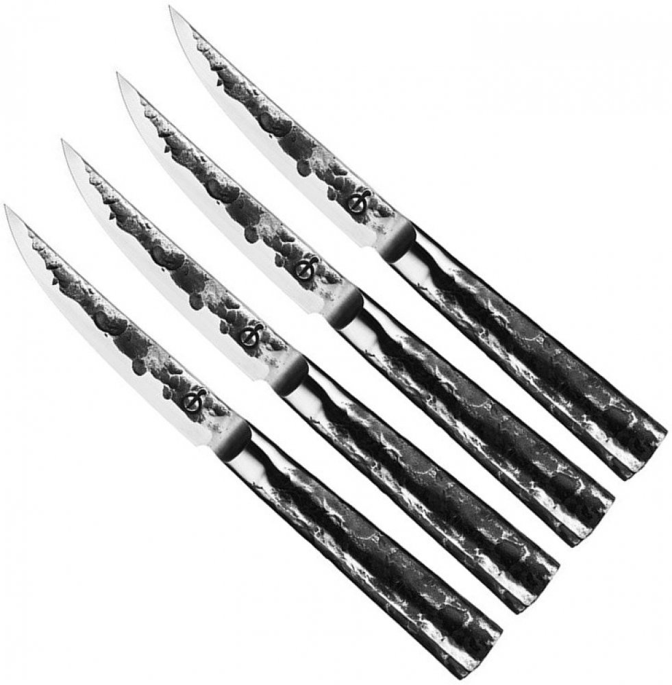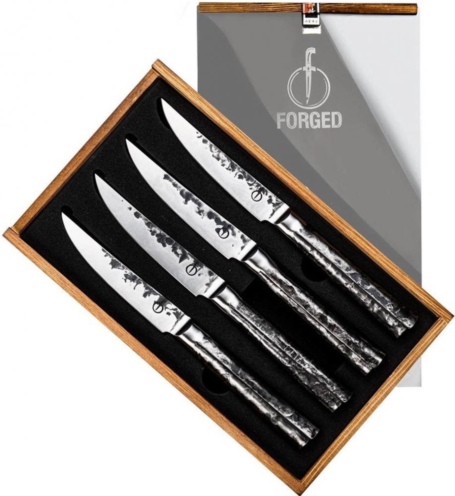 Čtyřdílná sada ručně kovaných steakových nožů Forgedz kolekce Intense je vhodná pro všechny milovníky grilovaného a pečeného masa. Ostří je dlouhé 11,5 cm a je vyrobené z kvalitní japonské oceli. Decentní vzhled, vysoký lesk a přiznané prvky kovářského opracování, dělá z nožů ideální a funkční doplněk k vašemu grilovaní. Sada steakových nožů je dodávána v luxusní dárkové krabici z páleného dřeva a může být tak vhodným dárkem pro každého šikovného kuchaře. Záruka na čtyřdílnou sadu nožů Intense je 10 let.