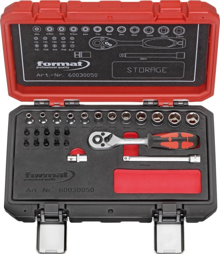 Sada adaptér-bitů 1/4", 6hran, 25 díl.Provedení: Nářadí vyrobené z chromvanadiové oceli, matně pochromované, nástrčkové klíče s rýhováním, inbusy a čtyřhrany mají zaoblené rohy kvůli ochraně trnu a hlavy šroubu. Ráčna s přepínací páčkou má 72 zubů, úhel zpětného otočení 5°, s rukojetí Kraftkant®. Dodává se v robustním červeno-černém plastovém boxu se schematickým údajem o umístění na víku. Nářadí je stabilně uloženo v 2-barevné pěnové vložce, tím se dá okamžitě zjistit, které nářadí chybí.Obsah sady: 1 ráčna s přepínací páčkou 12 nástrčkových klíčů, 6hran 4; 4,5; 5; 5,5; 6; 7; 8; 9; 10; 11; 12; 13 mm 1 bit plochý 4 mm 2 bity, křížové PH 1; 2 2 bity, křížové PZ 1; 2 5 bitů vnitřní TORX® T 10; 15; 20; 25; 30 1 nástavec 105 mm 1 adaptér na bity 1/4"