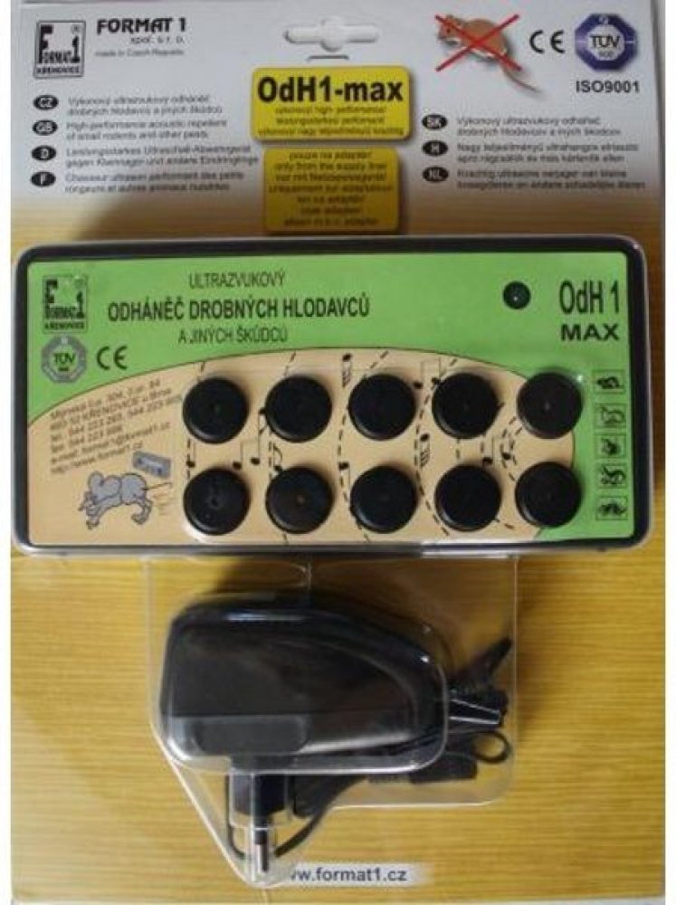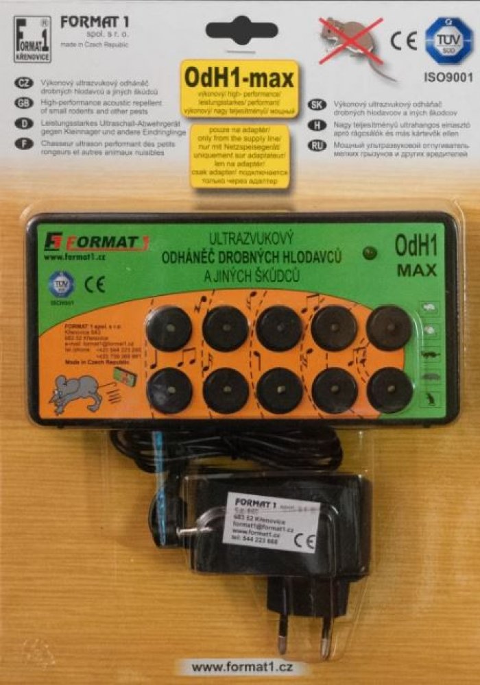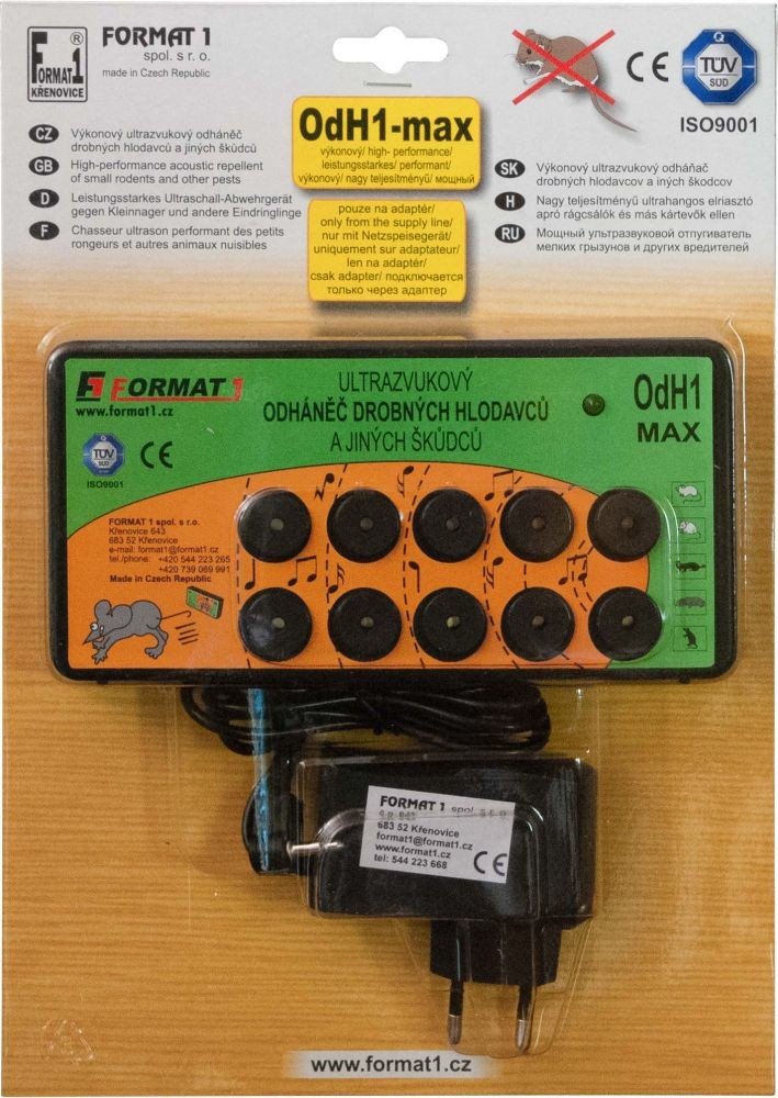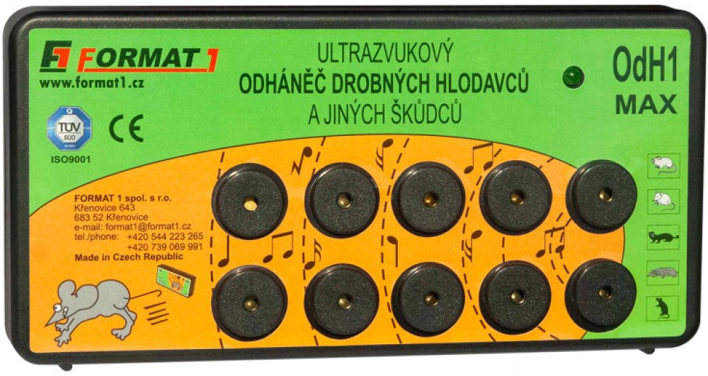 Zvukově-ultrazvukový elektronický odháněč myší, kun, krys, lasiček a potkanů. Jedná se o ryze český produkt s dlouholetou tradicí na trhu (od r. 1991) vyráběný přímo u nás ve firmě FORMAT1 spol. s r. o. Spolehlivý, výkonný, za dobu více jak 29 let ověřený mnoha zákazníky. Neškodný jak pro člověka a domácí hospodářská zvířata.