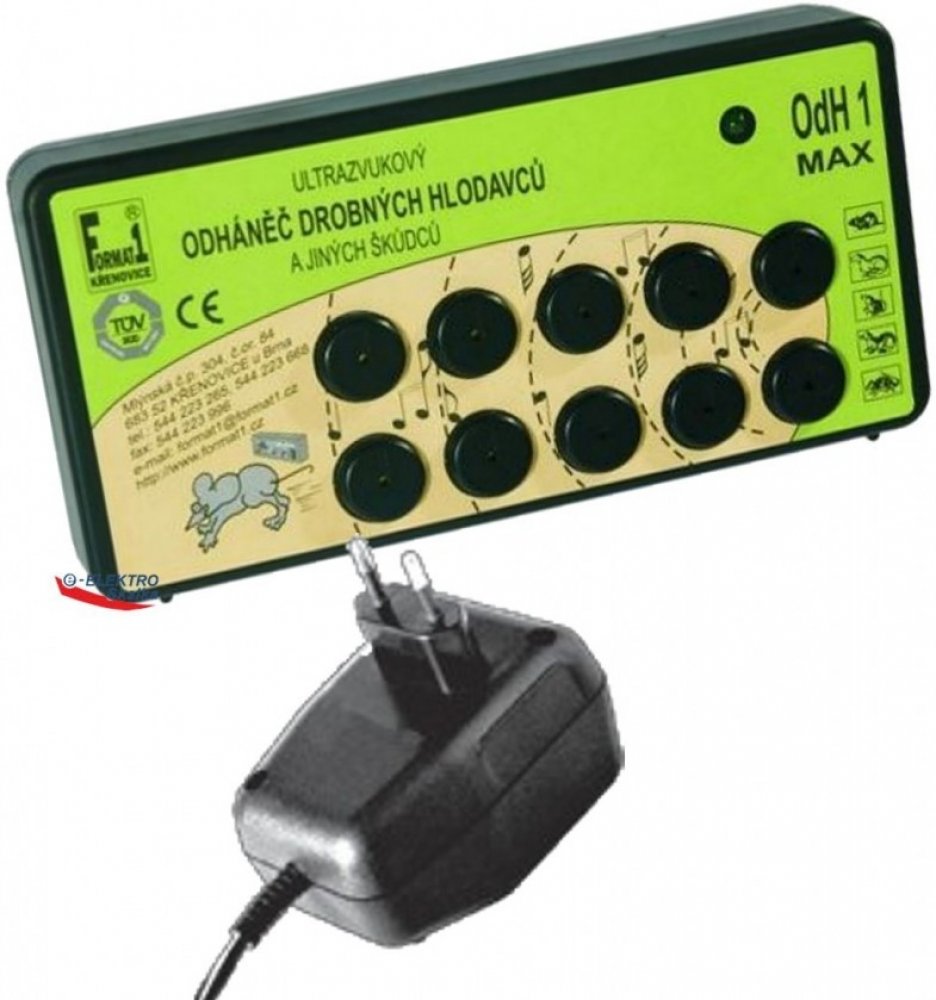 Plašič myší a kun Odh1 Max Format1 ultrazvukový se zdrojemVelmi výkonový ultrazvukový odháněč FORMAT1 OdH1Max drobných hlodavců, proti myším, kunám, potkanům, krysám, lasičkám, tchořům a dalším škůdcům pro plochu až 200m2.