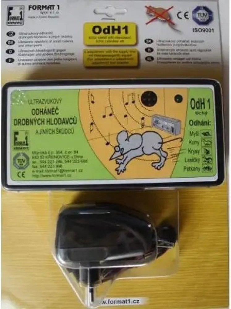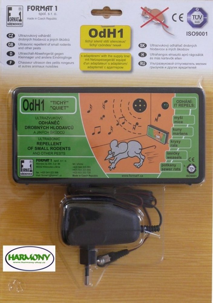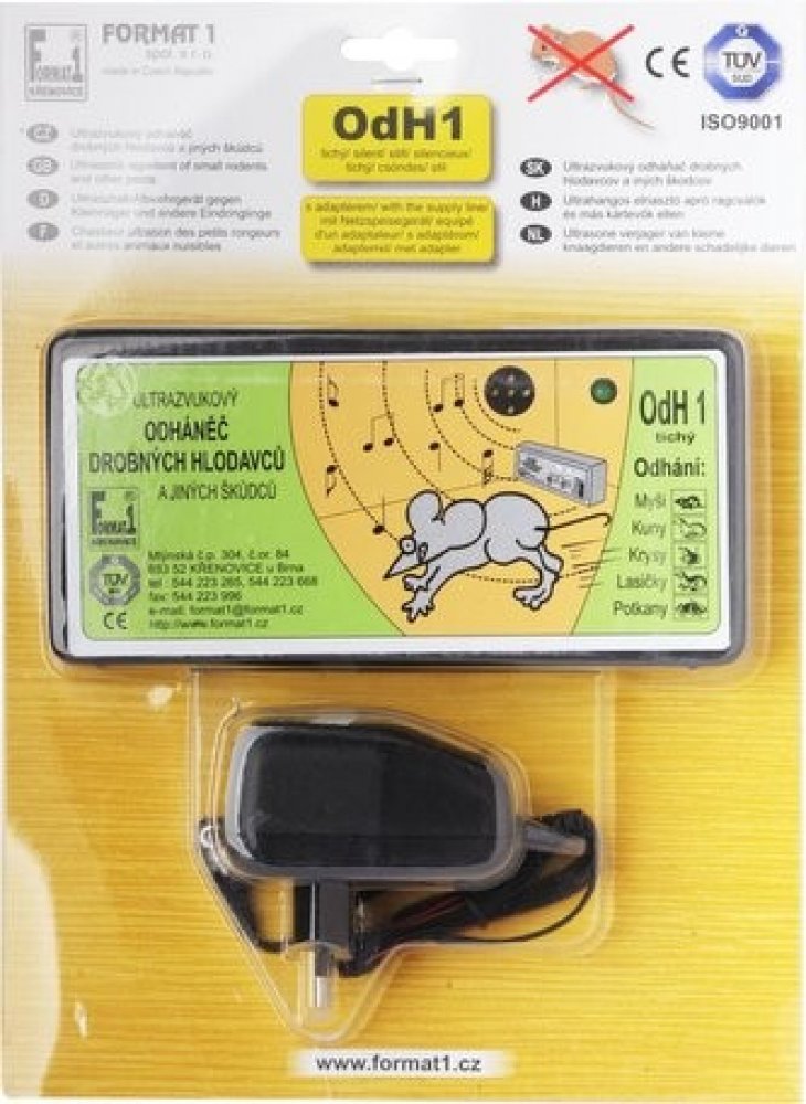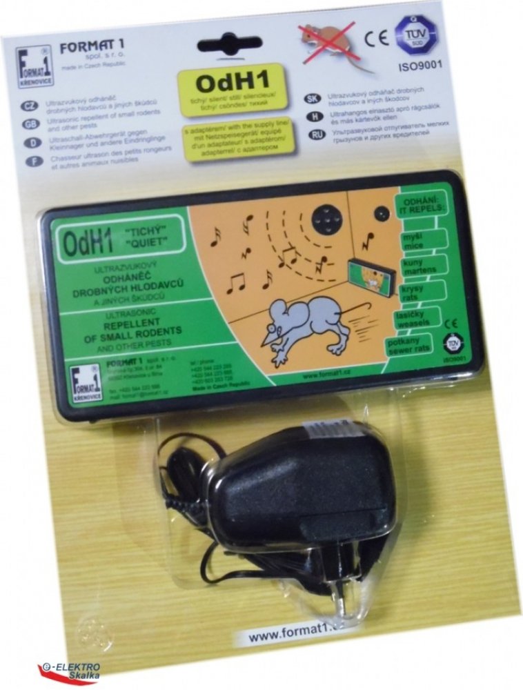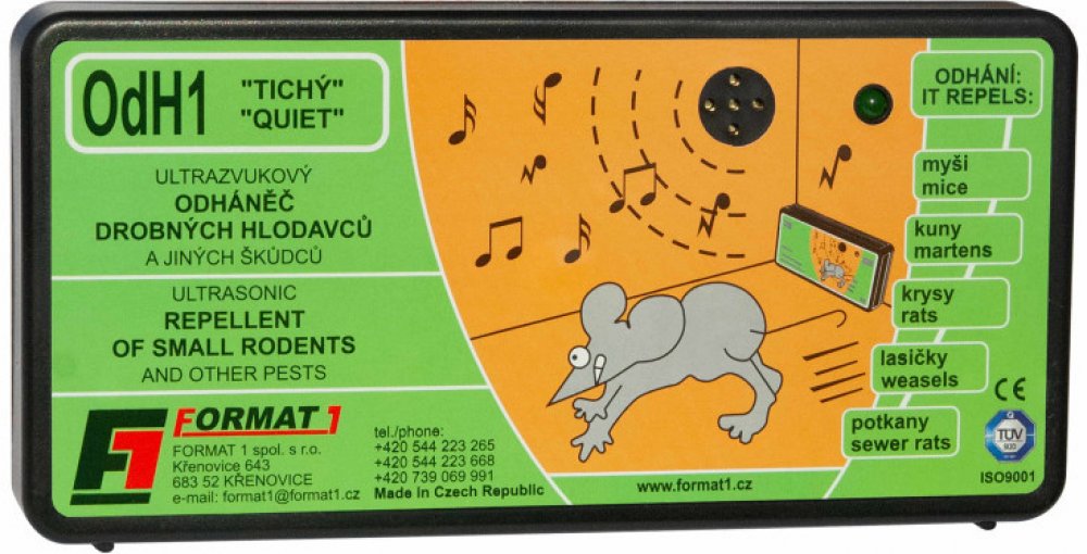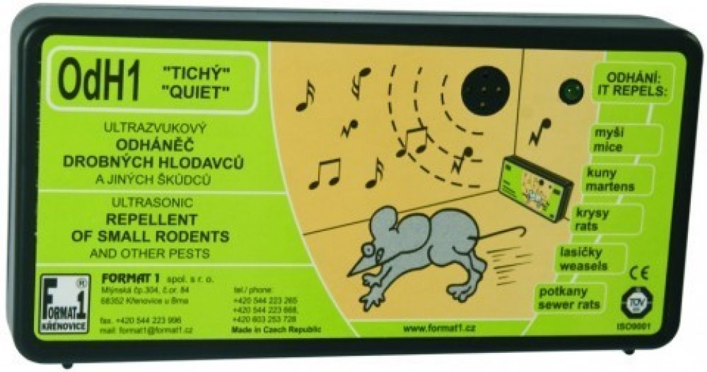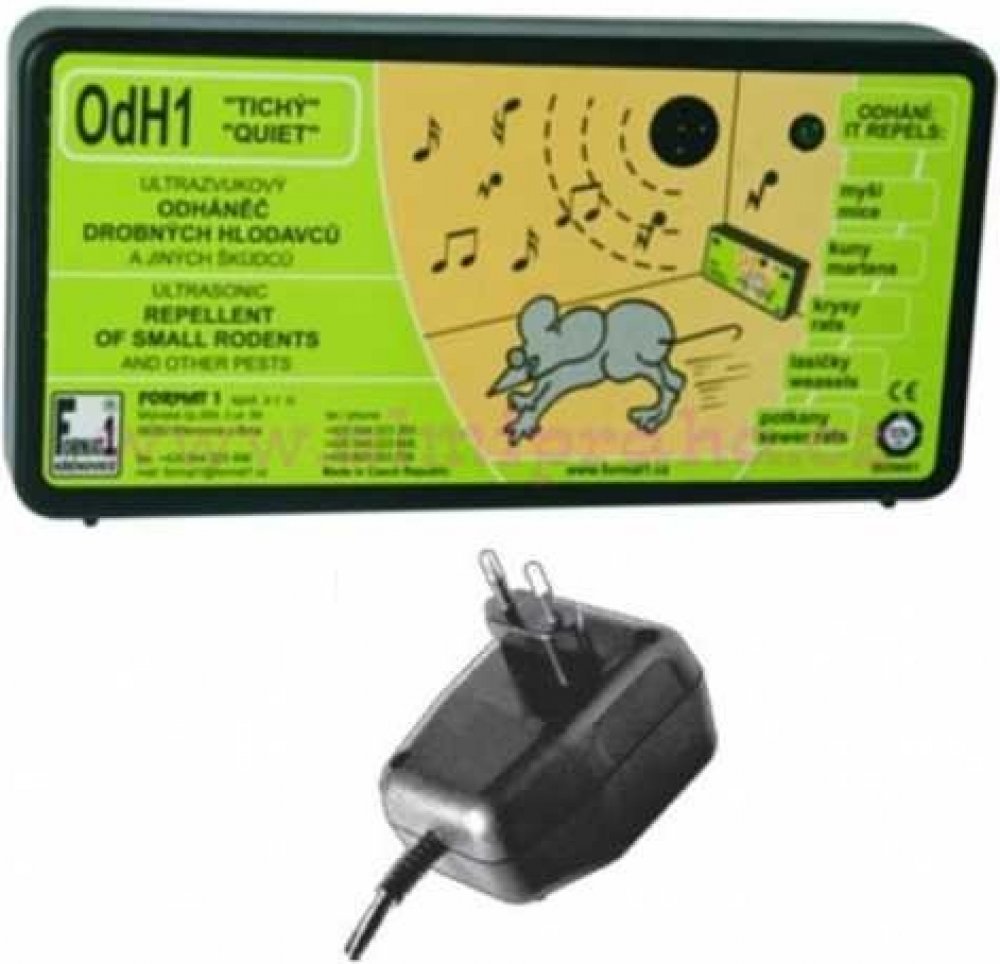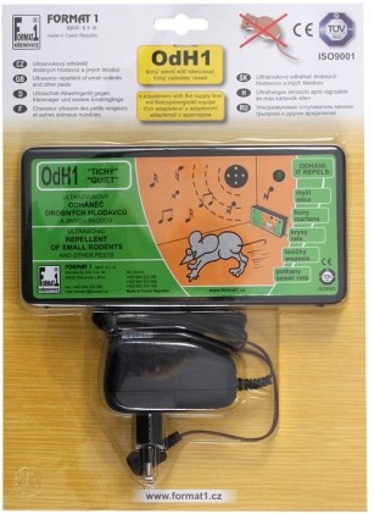 Ultrazvukový elektronický odháněč myší, kun, krys, lasiček a potkanů. Jedná se o ryze český produkt s dlouholetou tradicí na trhu (od r. 1991) vyráběný přímo u nás ve firmě FORMAT1 spol. s r. o. Spolehlivý, výkonný, za dobu více jak 29 let ověřený mnoha zákazníky. Neškodný jak pro člověka a domácí hospodářská zvířata. Přístroj vytváří pro škůdce nepříjemné zvukové prostředí (v oblasti ultrazvuku), škůdci postupně opustí chráněný prostor. Přístroj je tedy naprosto humánní, nezabíjí zvířata, neškodí jim, pouze jim znepříjemní pobyt v chráněném prostoru, tedy je odhání. Nevyužívá žádných chemických přísad."Tichý" znamená, že většina lidí jej skutečně neslyší. Osoby s citlivým sluchem, děti apod. však mohou občas slyšet vysoké tóny (vypísknutí). Je to proto, že ultrazvuk (tedy zvuk nad hranicí slyšitelnosti pro lidské ucho), který přístroj vydává, místy zasahuje až k hranici slyšitelného pásma. Plašič na myši ODH1 „tichý“ neškodí lidem, domácím zvířatům, jako např. pes, kočka, králík, slepice apod. Neškodí ptákům, lze instalovat i do voliér pro exotické ptactvo. Je vhodný do kurníků pro ochranu krmiva i slepic.Pro větší plochy lze využít výkonnější typ OdH1MAX nebo OdH1Supermax, anebo v příadě členitější chráněné plochy lze pořídit dva či více přístrojů ODH1 „tichý“. Navzájem se neovlivňují a jejich účinnost se zvýší.
