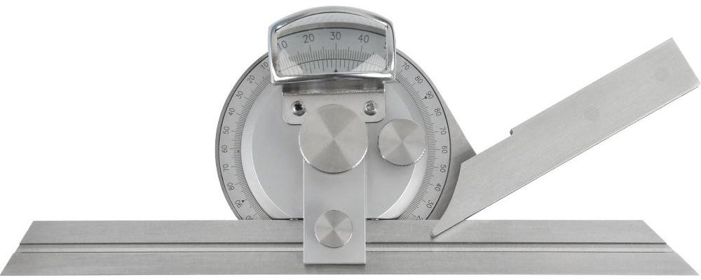 Provedení: Odečítání přes zvětšovací sklíčko pro zorné pole po celé délce nonia, leštěno najemno. Rychlé odčítání a nastavení úhlu díky přehlednému očíslování kotoučové stupnice 4 x 90°, odečítání stupnice na noniu 1/12 stupňů = 5 úhlových minut, antireflexní stupnice, matně chromované. Dodáváme s měřicí lištou o délce 150, 200 a 300 mm, v plastovém boxu.