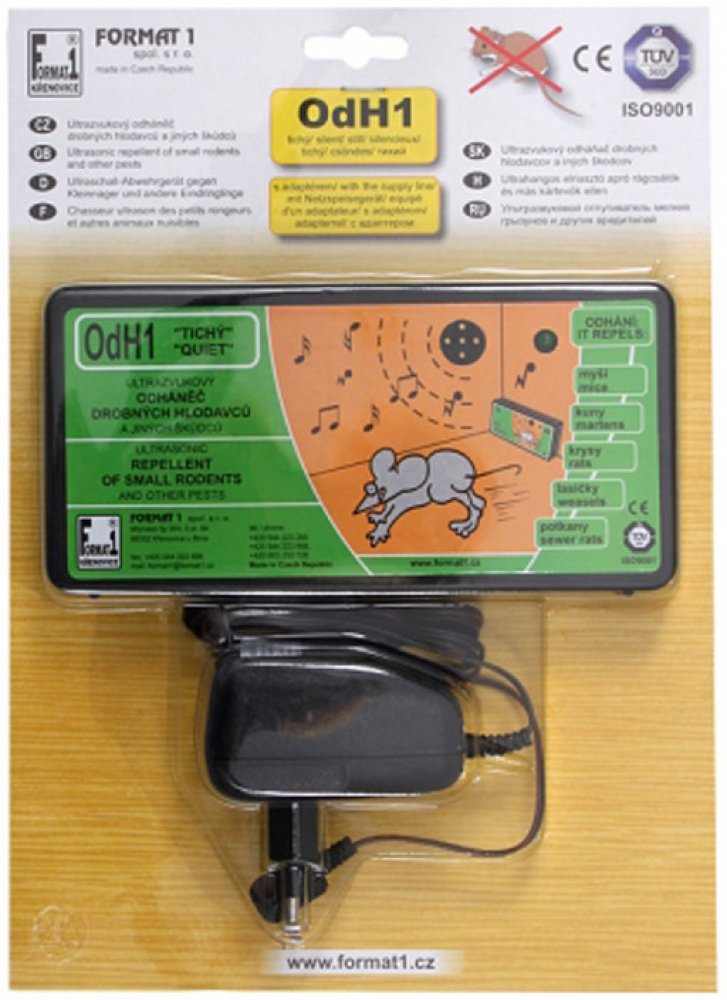 Odháněč kun, myší a potkanů ultrazvukový tichý s adaptérem Ultrazvukový plašič myší, kun, krys, lasiček a potkanů napájený z elektrické sítě nebo pomocí šesti baterií je naprosto tichý. Odháněč vydává ultrazvukové vlny, které jsou pro člověka nad hranicí slyšitelnosti. Přístroj je nenávykový, neboť frekvence zvuku se zcela náhodně mění, a to jak ve výšce, tak v čase. Pokud by tomu tak nebylo, škůdci by si na jeden trvalý tón postupně zvykli a odpuzovač by tím ztrácel na účinnosti.Odpuzovač myší je možné použít v jakýchkoli uzavřených či polouzavřených prostorách o velikosti do cca 100 m². Mohou to být nejen obytné místnosti jako jsou byty, chaty nebo chalupy, ale i malé sklady, sklepy, garáže či půdy. Plašič neškodí lidem ani domácím zvířatům (psům, kočkám, králíkům apod.) Neškodí též ptákům, proto jej můžete instalovat i do voliér pro exotické ptactvo. Je vhodný i do kurníků pro ochranu slepic i krmiva. V případě, že je ochraňovaná plocha členitější, můžete použít dva či více odpuzovačů, jejichž účinnost se tak zvýší a navzájem se neruší.Odpuzovač kun a drobných hlodavců je velmi humánní, neboť zvířata nezabíjí, neškodí jim, jen jim znepříjemňuje pobyt v chráněném prostoru, tudíž je odhání. Nevyužívá žádné chemické přísady. Přístroj je schválen dle platných předpisů a norem v ČR. Parametry ultrazvukového odháněče kun, myší a potkanů ODH1 s adaptérem: účinost: myši, kuny, krysy, lasičky, potkani zvuky: čistě v oblasti ultrazvuku (náhodně přelaďované v čase i frekvenci, nepravidelně dlouhé tóny s nepravidelně dlouhými přestávkami) prostředí: uzavřené či polouzavřené prostory okolní teplota: -20 °C až +60 °C účinná plocha: max. 100 m² napájení: síťový adaptér na 230VAC nebo 6 ks baterií řady "C" (R14, "střední monočlánky") rozměry: 18,5 x 3,1 x 8,8 cm hmotnost: 0,32 kg