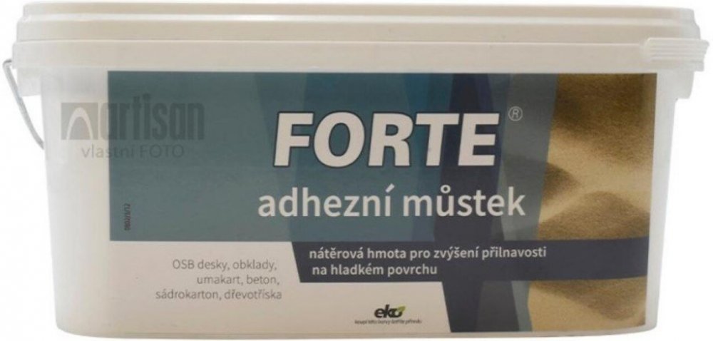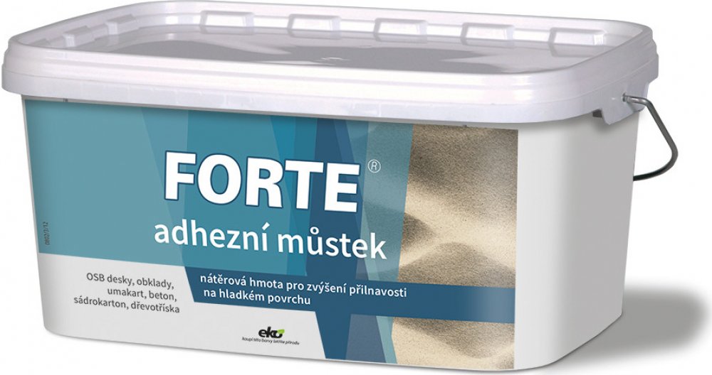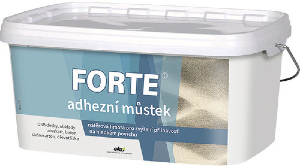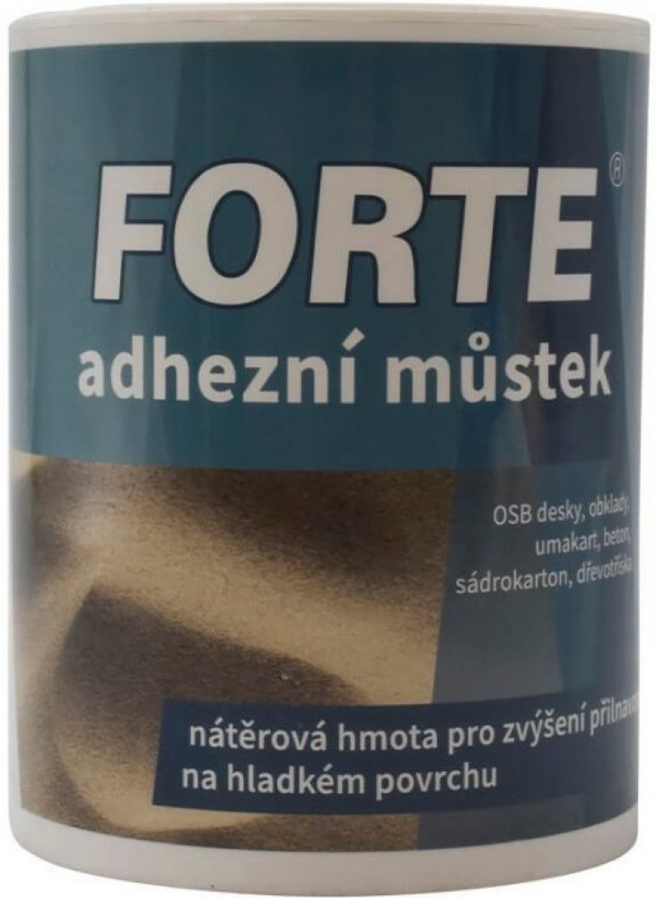 FORTE adhezní můstek je určen k nátěrům hladkých betonových povrchů, vláknocementových, sádrokartonových a dřevoštěpkových desek před nanášením dekorativních omítek apod. Zvyšuje přilnavost dalších aplikovaných vrstev, povrchových úprav a usnadňuje jejich nanášení. Nátěr lze použít i jako adhezní můstek při lepení tepelných izolantů, zejména pěnového polystyrénu. FORTE adhezní můstek výrazně zvýší drsnost podkladu a zaručí vyšší přídržnost omítky popř. lepidla nanesených později.