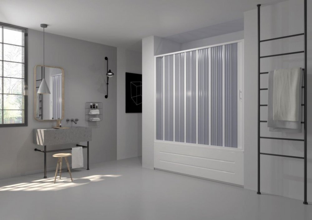 Plastová vanová zástěna VASCA MARTE NEW s rozměrovou a tvarovou variabilitou systému FLEX přináší maximální úsporu místa do všech koupelen. Umožňují to shrnovací transparentní profily - lamely, vsazené do vysoce kvalitního plastového rámu. Tento model nabízí dva typy zavírání (na stranu / do středu). Díky své odolnosti vůči nárazům jsou vhodné i do hotelů a penzionů.