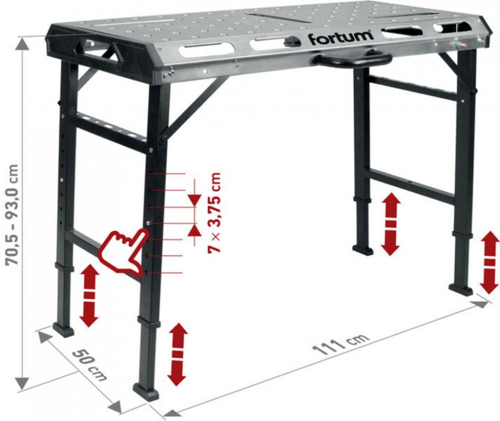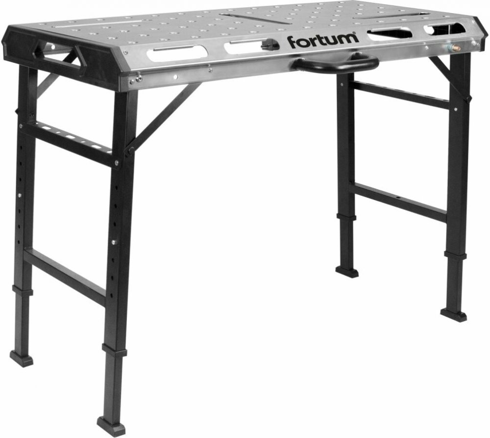 Přenosný svařovací stůl FORTUM s výškovým nastavením pracovní plochy o rozměrech 107x53cm vyrobené z galvanizovaného ocelového 2mm tlustého plechu s množstvím manipulačních výřezů a otvory o průměru 20mm pro vymezovací/opěrné zarážky nebo upínací svěrky Max.