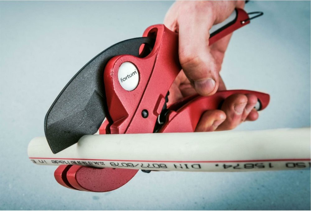 Profesionální nůžky na plastové trubky FORTUM jsou určeny pro řezání plastových trubek o průměru 0-42 mm. Jejich hlavní předností je speciálně tvarovaný trojúhelníkový břit, který je potažený teflonem pro snadnější a plynulejší pronikání materiálem.