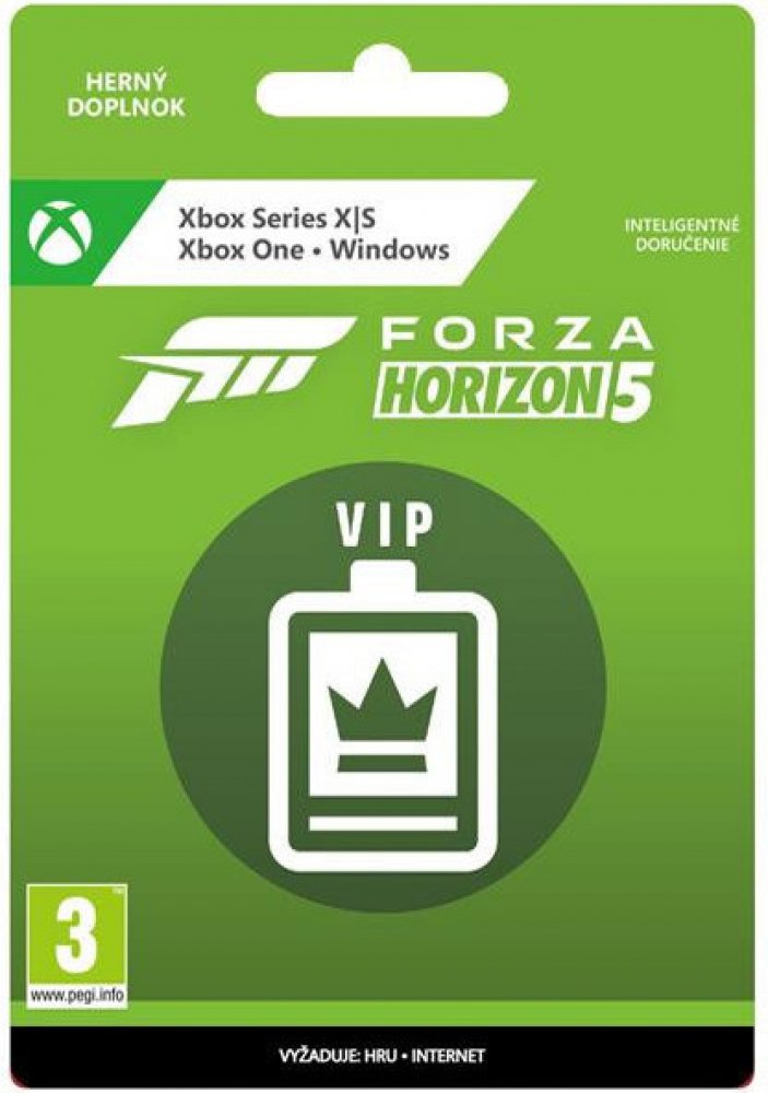DLC pro XONE/XSX/ PC - VIP členství Forza Horizon 5 nabízí exkluzivní odměny, se kterými si hru užiješ ještě více a které tě odliší od všech ostatních hráčů na Festivalu Horizonu. VIP dostávají 3 exkluzivní auta Forza Edition, korunu, individuální doplňky, emotikonu a klakson, darovaný dům pro hráče, 2× vyšší odměny v kreditech za závody, týdenní bonusová zatočení superkolem štěstí a další výhody.