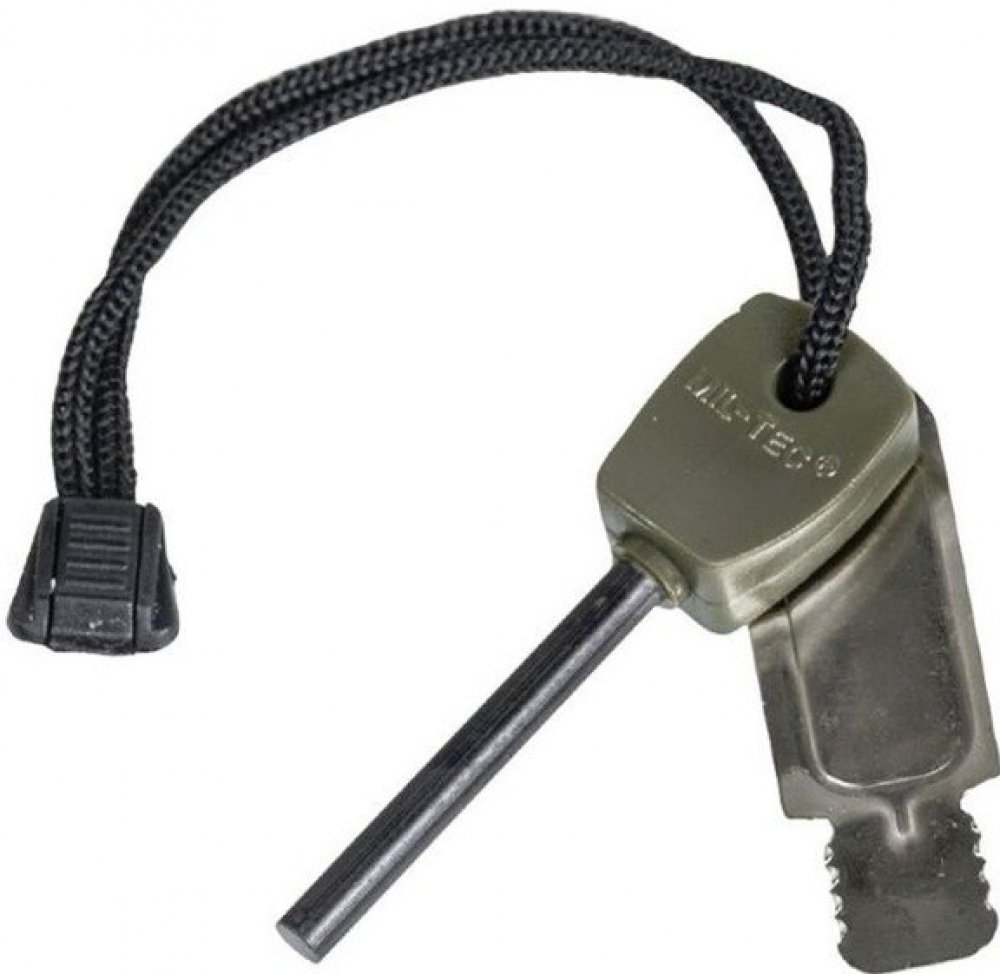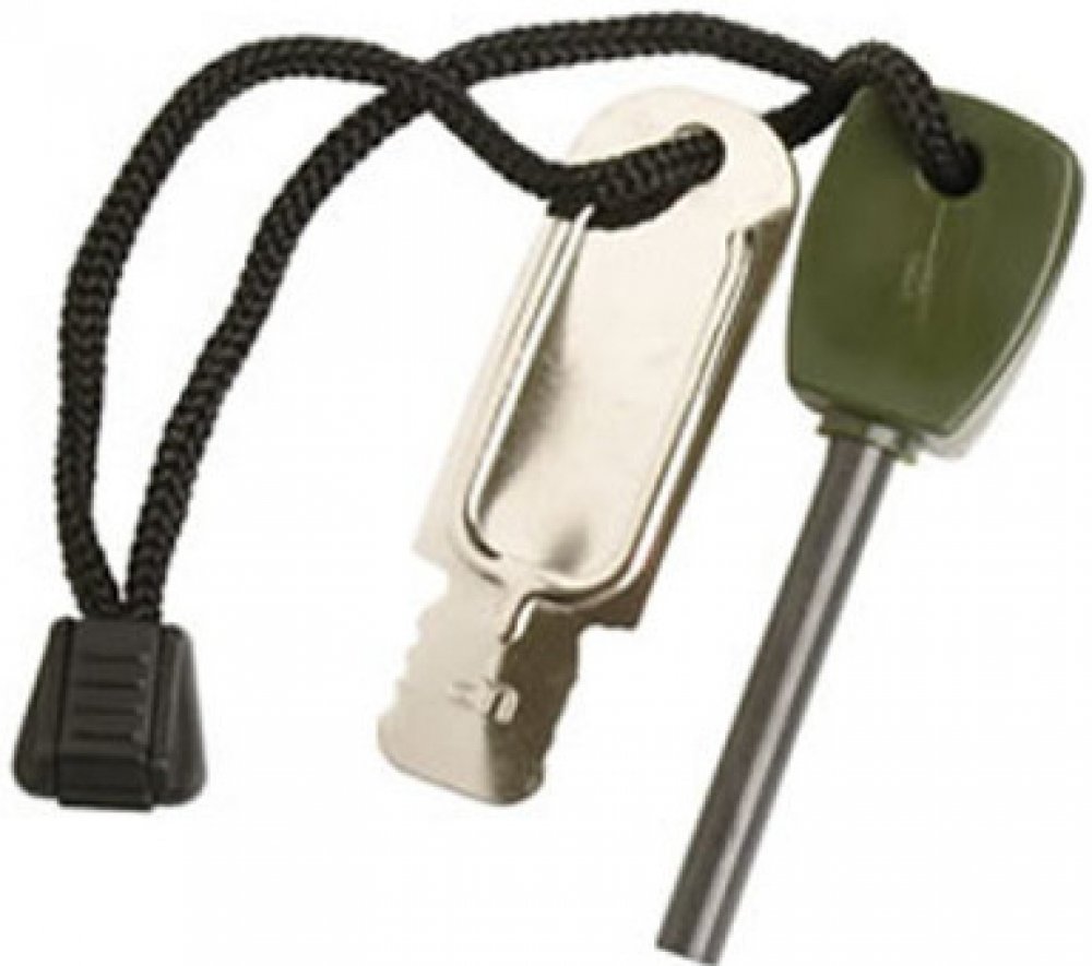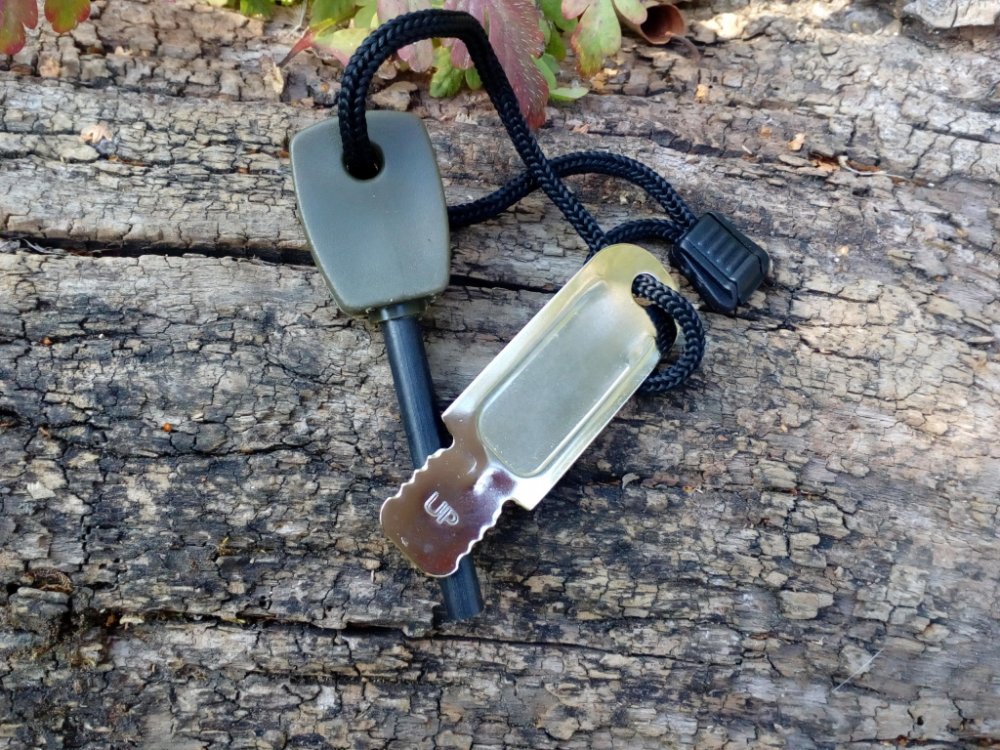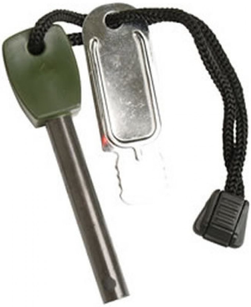 Křesadlo tvoří ocelová tyčinka z hořčíkové slitiny a s plastovým držákem. Je navlečena společně s křesacím plíškem na černém nylonovém provázku.