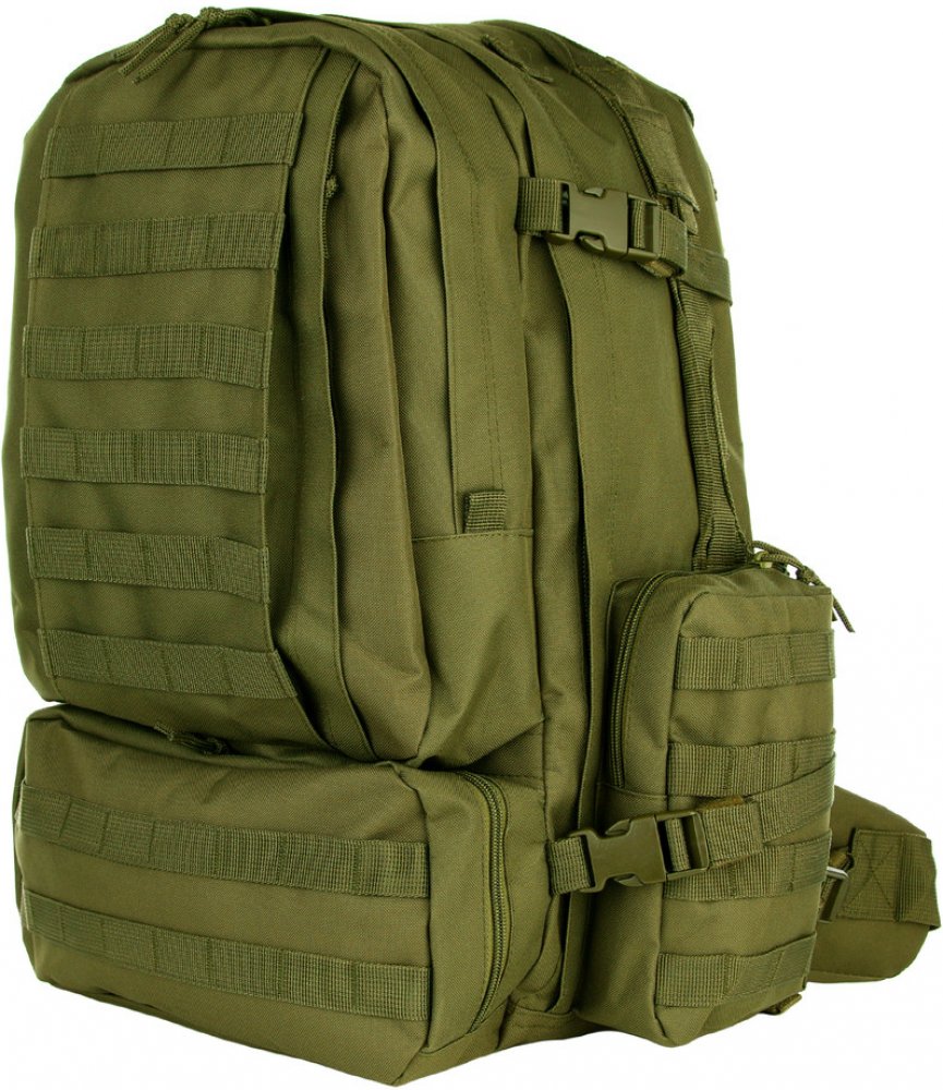 Větší, tzv. třídenní modulární útočný batoh Široké a pohodlně polstrované ramenní popruhy s hrudní sponou, fastexovými přezkami pro případ potřeby nouzového odhození batohu, a očky pro uchycení výstroje.Nastavitelný bederní pás.Komfortní polstrování zad ze speciálnho protišokového materiálu s odvětrávácími drážkami.Plochá kapsa mezi hlavní kapsou a polstrováním, kam se vejdou dokumenty, nebo balistický plát nebo třeba německá skládací karimatka.Celkem sedm samostatných kapes, hlavní, zádová, přední horní, přední plochá, přední spodní a dvě boční.Všechny kapsy kromě zádové a přední ploché se zepínají dvojitým zipem, u hlavní a přední horní navíc překrytým légou.Hlavní kapsa obsahuje úchyty pro hydratační vak (do 3L), dvě síťové extra kapsy se zapínáním na zip a řemínky s fastexovými přezkami pro uchycení výstroje.Horní přední kapsa má zevnitř dvě menší plochá kapsy, dvě kapsy na vysílačky a kapsy na pera a tužky.Na PALS panelu horní přední kapsy je plochá kapsa na dokumenty a dva velcro pásky pro uchycení jmenovek.Spodní přední kapsa (cca 31 x 15 x 8cm) obsahuje jednu velkou a tři malé síťové kapsičky.Na horní straně hlavní kapsy jsou tři průchodky pro hadičky hydratačních systémů, sluchátkové kabely či radioantény.Na přední straně celkem 8 řad PALS, na bocích 4 řady.Boční kapsy mají rozměry cca 22 x 13 x 6cm.Veškeré kapsy mají na spodní straně odtokové otvory.Nosná rukojeť je nejen nahoře, ale i na bocích batohu.Na každé straně se nachází dva kompresní stahovací pásky s fastexovými přezkami.Rozměry batohu: cca 55cm výška, cca 42cm šířka a cca 28cm hloubka.Hmotnost cca 2700gObjem batohu cca 65LMateriál: Denier 1000 Nylon