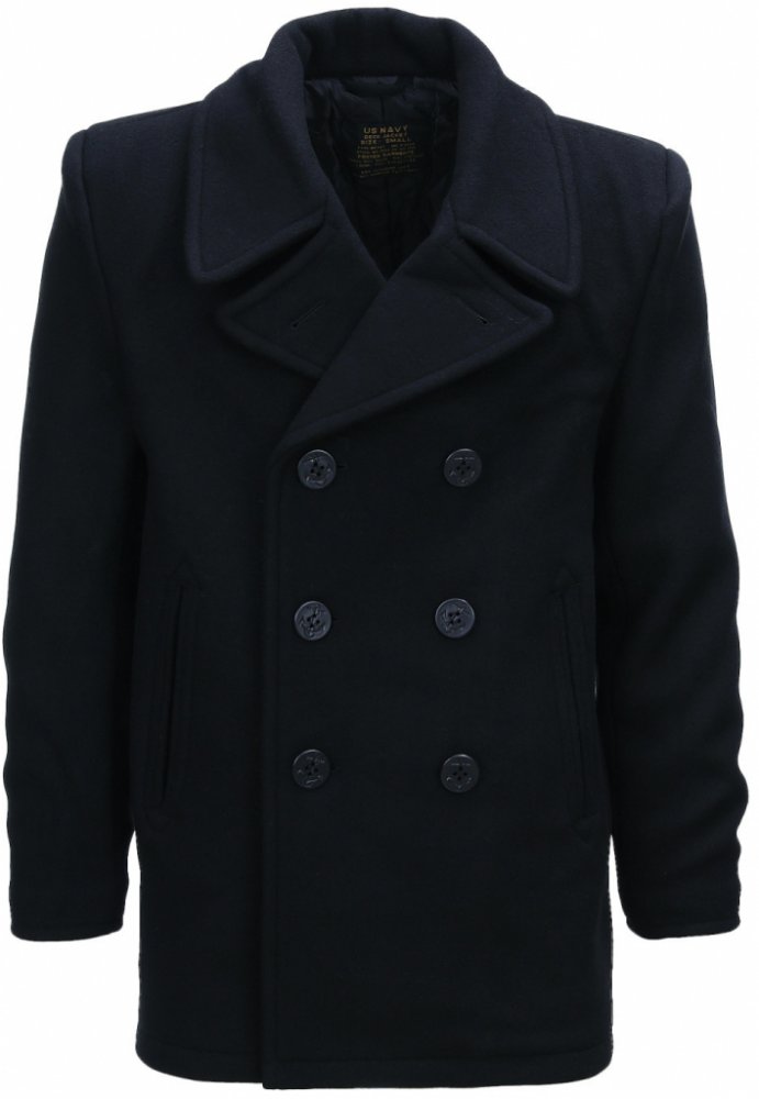 Klasický vlněný kabát Pea Coat uživaný americkým námořnictvem s typickým dvouřadým zapínáním a motivem kotvy na knoflících. Kabát má dvě vnější a jednu vnitřní kapsu, podšívka je prošívaná.