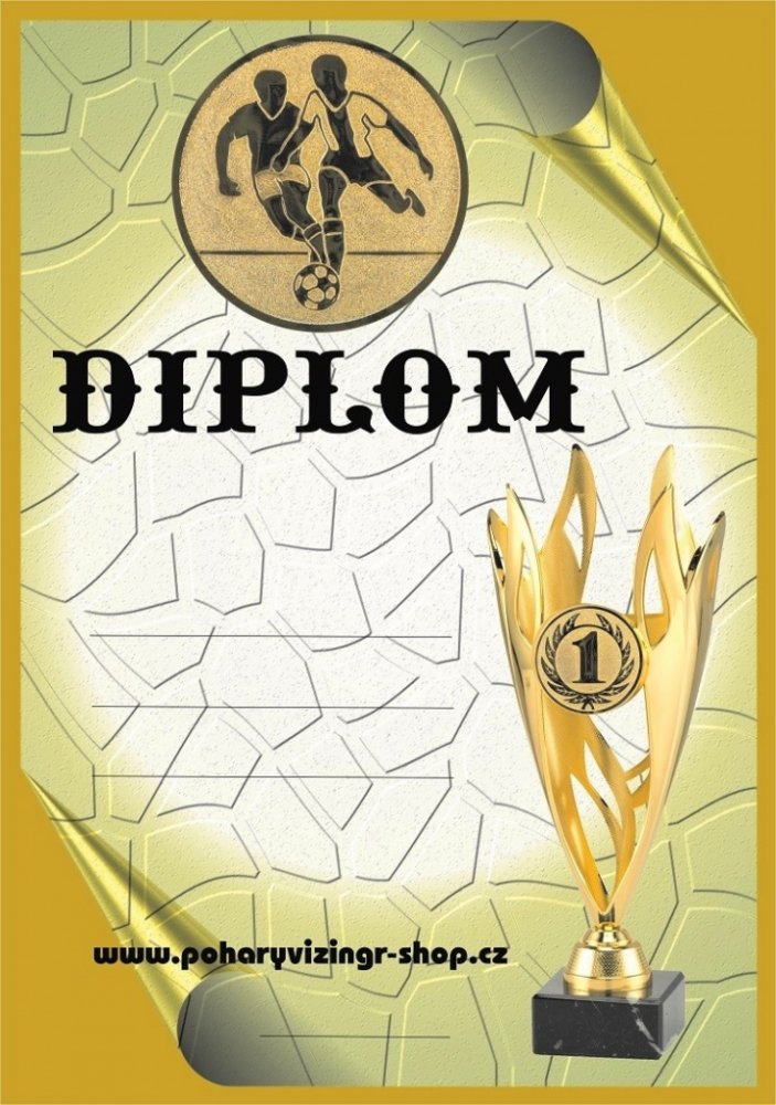 Fotbal č.50. Diplom formátu A4 (250 g). Objednáváte NEVYPLNĚNÉ DIPLOMY (BEZ TEXTU) a chcete si je vyplňovat vlastní tiskárnou - napište do textu "BEZ LINEK". Objednáváte diplomy VYPLNĚNÉ - krátké a stejné texty napište zde. Požadujete-li dlouhé nebo různorodé texty napište je prosím ve svém PC a vložte soubor (např.PDF,Corel,WORD,Exel apod.) před uzavřením objednávky jako přílohu (2 krok pokladna). Do diplomu lze vložit i Vaše logo, foto apod. - pro realizaci je vhodné konzultovat e-mailem v jakém formátu požadované logo máte k dispozici.Vyplněné diplomy(četná uznání, pamětní listy apod.) Vám i zalaminujeme - vhodné domluvit na prodejně. -
