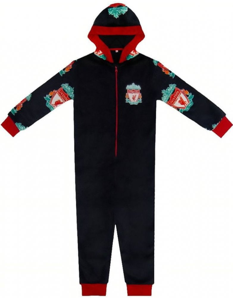 Stylové dětské pyžamo Liverpool FC. All-In-One. Černá barva. Kvalitní fleece. Pohodlné. Teplé. Oficiální produkt.