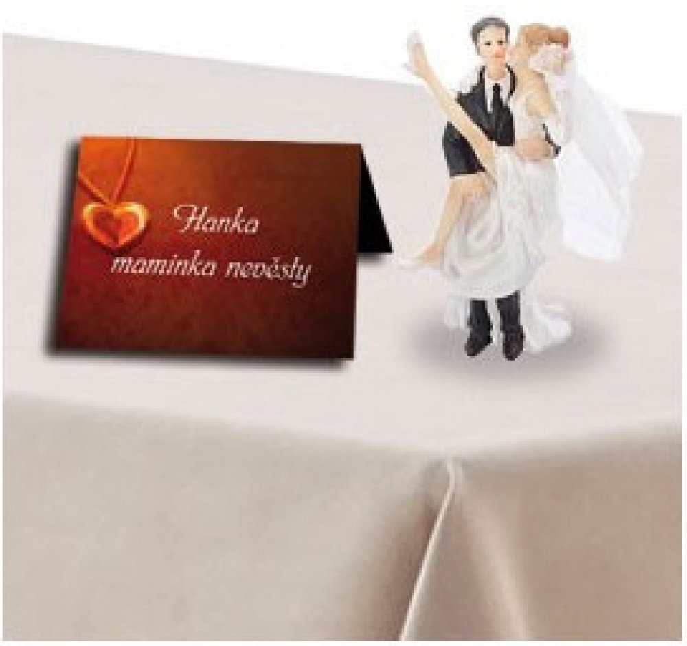 Jmenovky na svatební stůl. Jmenovky mají rozměr 102x76mm. Tyto svatební jmenovky na stůl tiskneme na fotopapír s jedním zlomem uprostřed, tak aby stály na stole. Svatební motiv si buď můžete vybrat z našich předloh, nebo jej vytvořit zcela sami fotkou, textem apod.