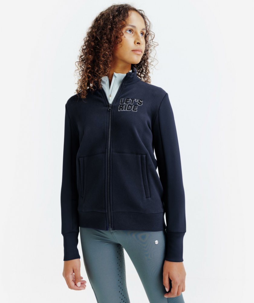 Jezdecká mikina pro mladé pokročilé jezdce. Hodí se do chladnějšího počasí. Hřejivá a pohodlná mikina. Pružná mikina kopíruje pohyby jezdce a díky všitým dílům na rukávech zůstává déle čistá. Dvě přední kapsy na zip na ohřátí rukou nebo uložení osobních předmětů.