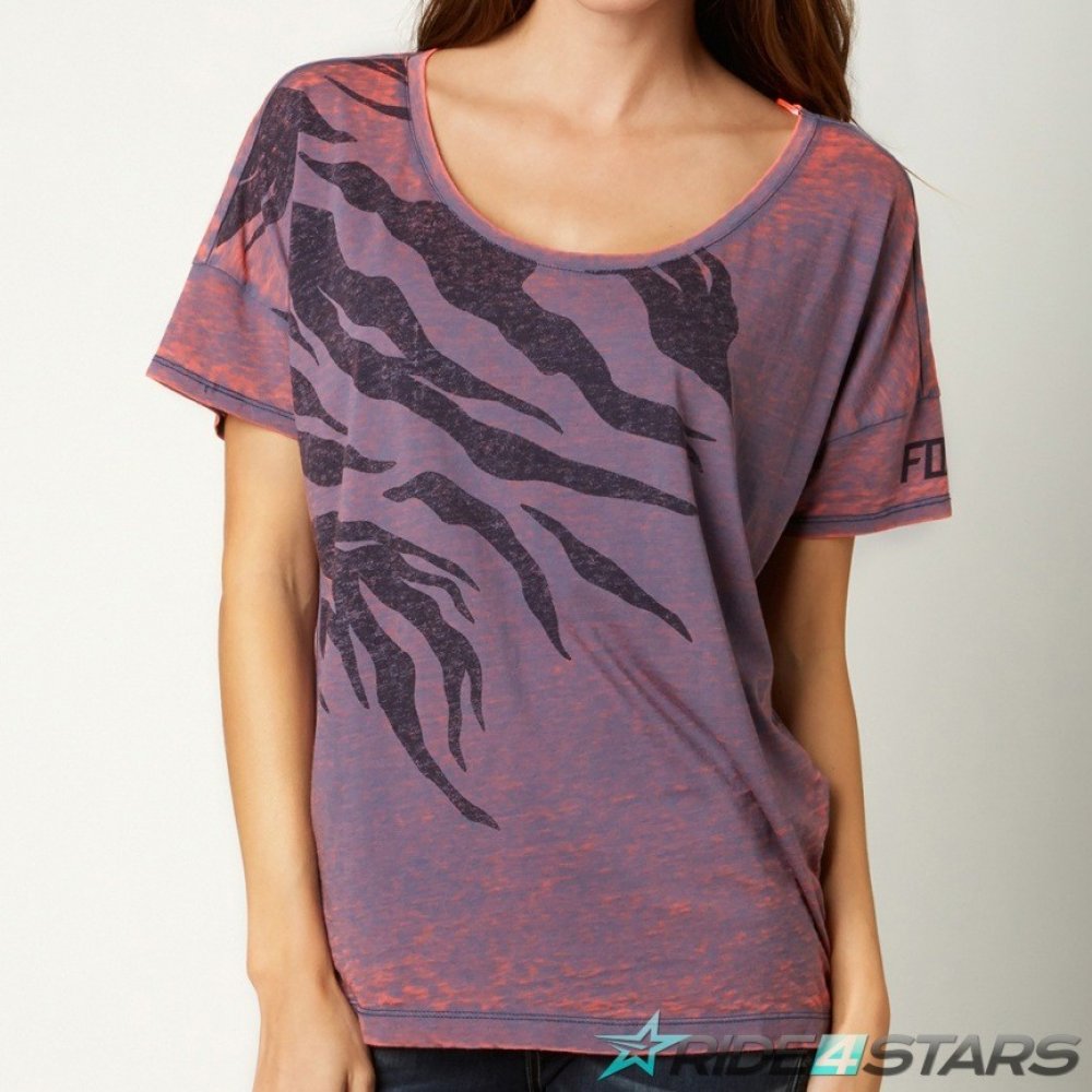 Dámské tričko Fox. Model VICIOUS WEDGE je vyroben z luxusnější kombinace polyesteru 50% a viskozového vlákna 50% ve 150g gramáži. Tričko je celé střiženo v širokém střihu se spadlými rameny. Žíhané provedení materiálu s decentním logem Fox na rukávu, kulatý výstřih, potisk hrudi se zebra motivem.