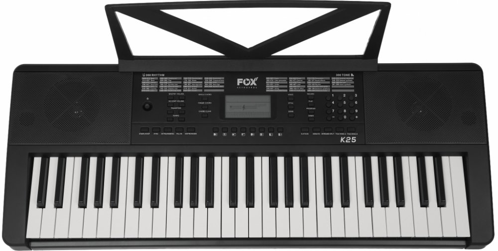 FOX K25 nabízí 54 kláves standardní velikosti s dynamikou, 300 klasických i elektronických zvuků, osm drum padů, 300 automatických doprovodů, nebo 50 demo songů. Nechybí ani pokročilé funkce jako Split (rozdělení klaviatury pro hru na dva nástroje zároveň), nebo nastavení Sustainu (dozvuku) a Vibrata. Klaviaturu lze rovněž transponovat, což ocení jak začátečníci, tak pokročilí hráči. Samozřejmostí je možnost hraní akordů jedním prstem, funkce Record pro záznam vašich pokusů nebo metronom a výukový systém. Ke klávesám je možné připojit mikrofon nebo externí zařízení s vašimi oblíbenými nahrávkami a zajamovat si tak s nimi.
