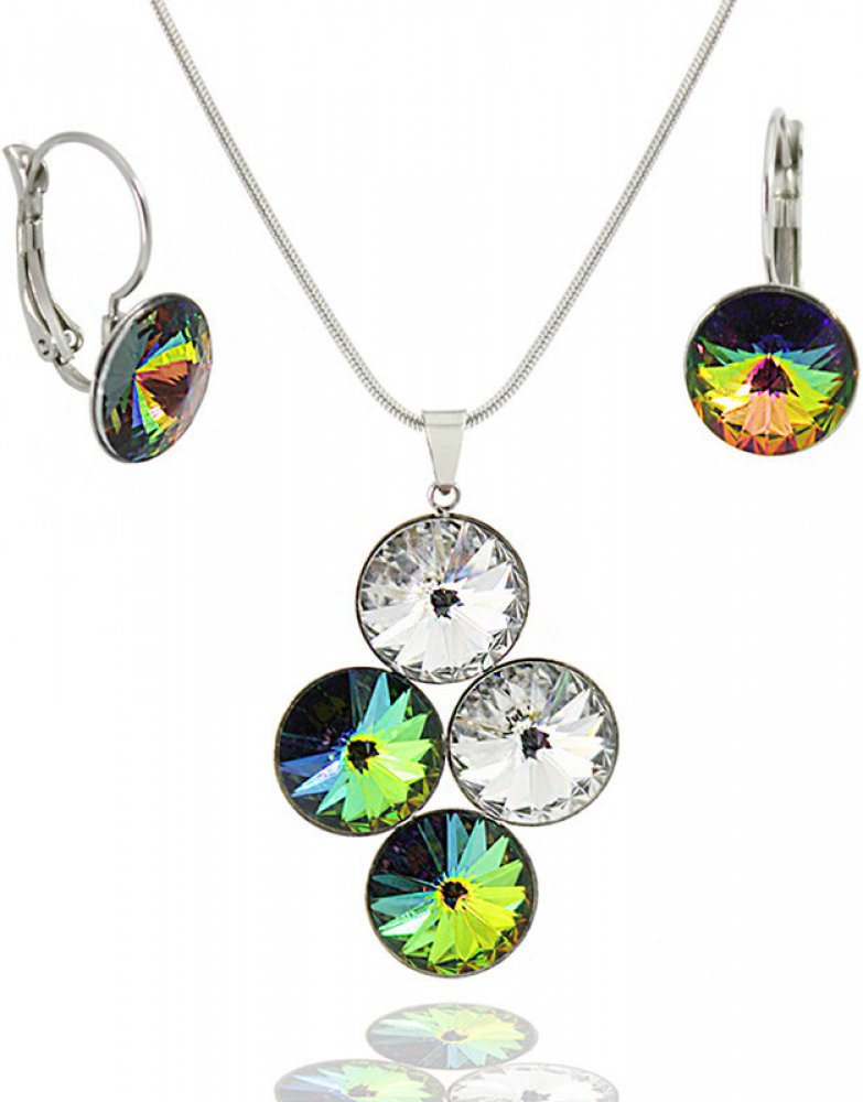 Souprava šperků z chirurgické oceli a ze Swarovski Rivoli VM Krystal v krásné zelené barvě o průměru 12mm, obsahuje přívěsek spolu s 45cm hadím řetízkem z chirurgické oceli a náušnice na mechanické zapínání. Jedná se o ruční českou výrobu, na kterou se vztahuje garance na doživotní bezplatnou opravu. Souprava je dodávána na bižuterní kartě, ale v případě zájmu o dárkové balení, Vám ji na požádání ...