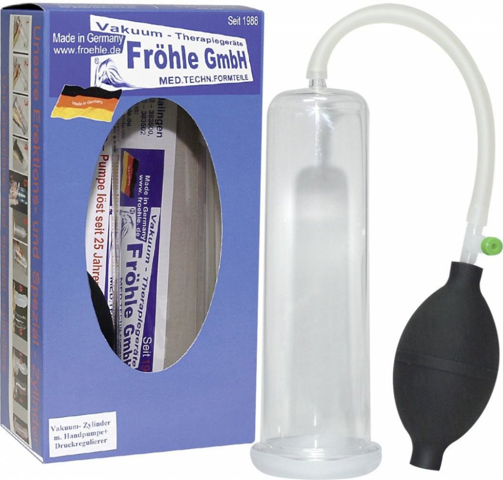 Fröhle Pump Set- Lékařsky a technicky testovaný produkt značky Fröhle, pro vytváření lokálního podtlaku penisu je špičkou ve svém oboru a proto opatřen patentovou ochranou. Přináší ihned více tuhosti a pevnosti vašeho penisu. Transparentní vakuový válec je 20 cm dlouhý, 5 cm široký. Materiál: PVC/PP, výrobek je bez ftalátů dle nařízení EU. Značka Fröhle GmbH.