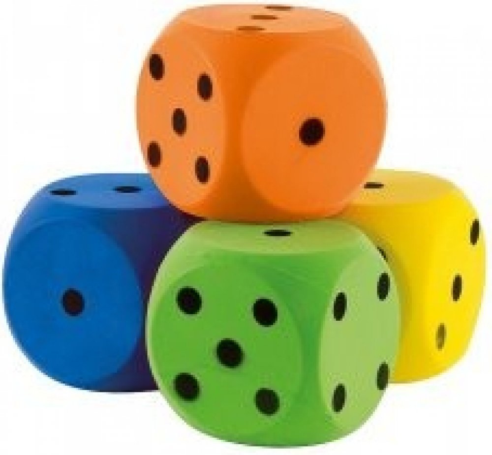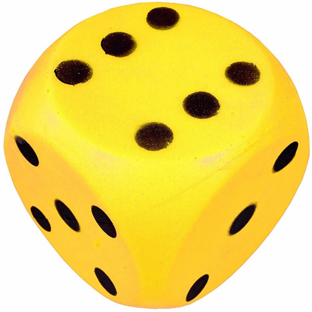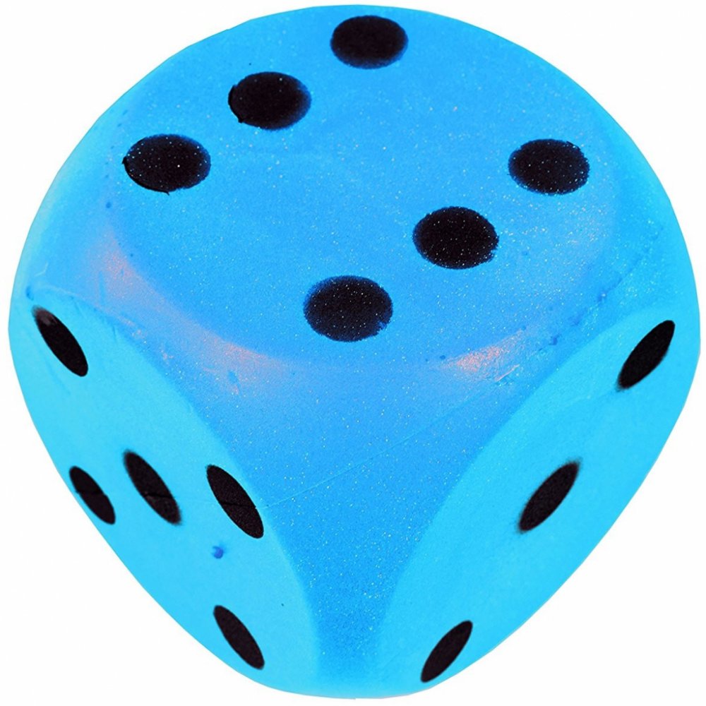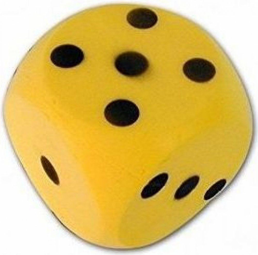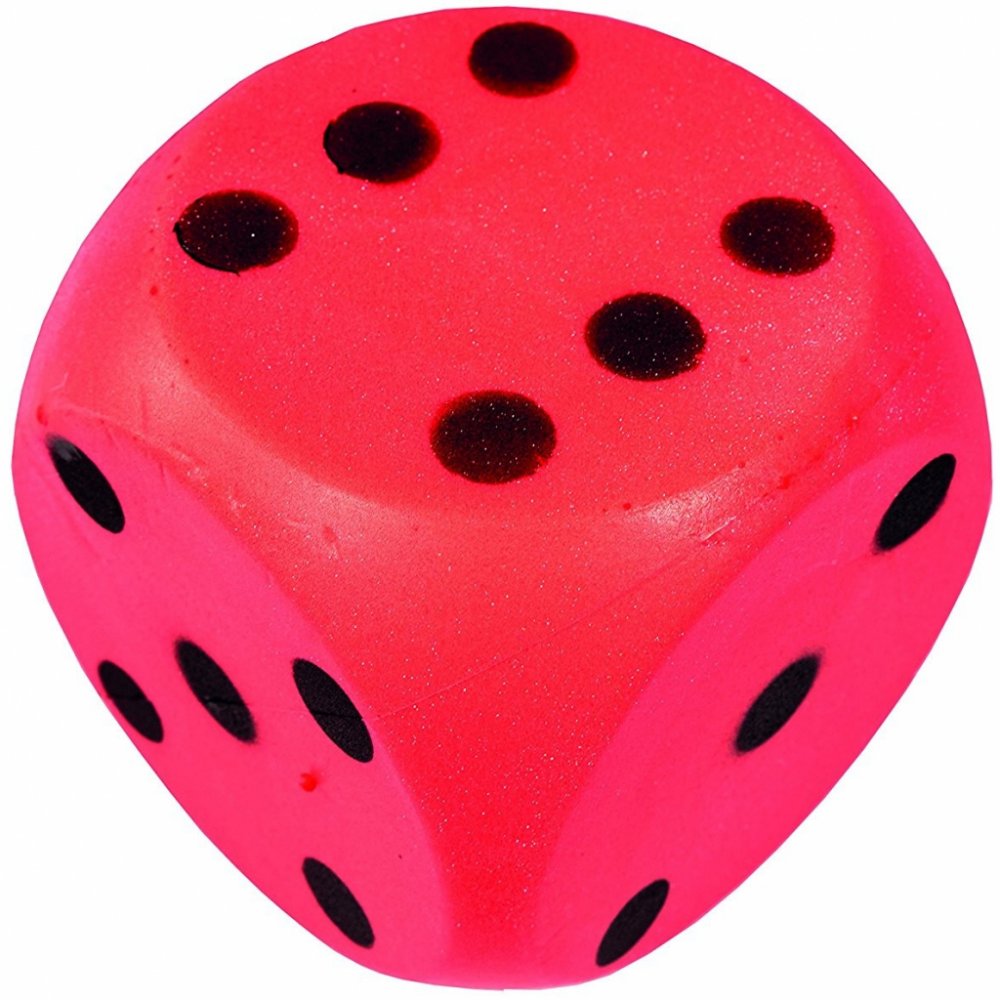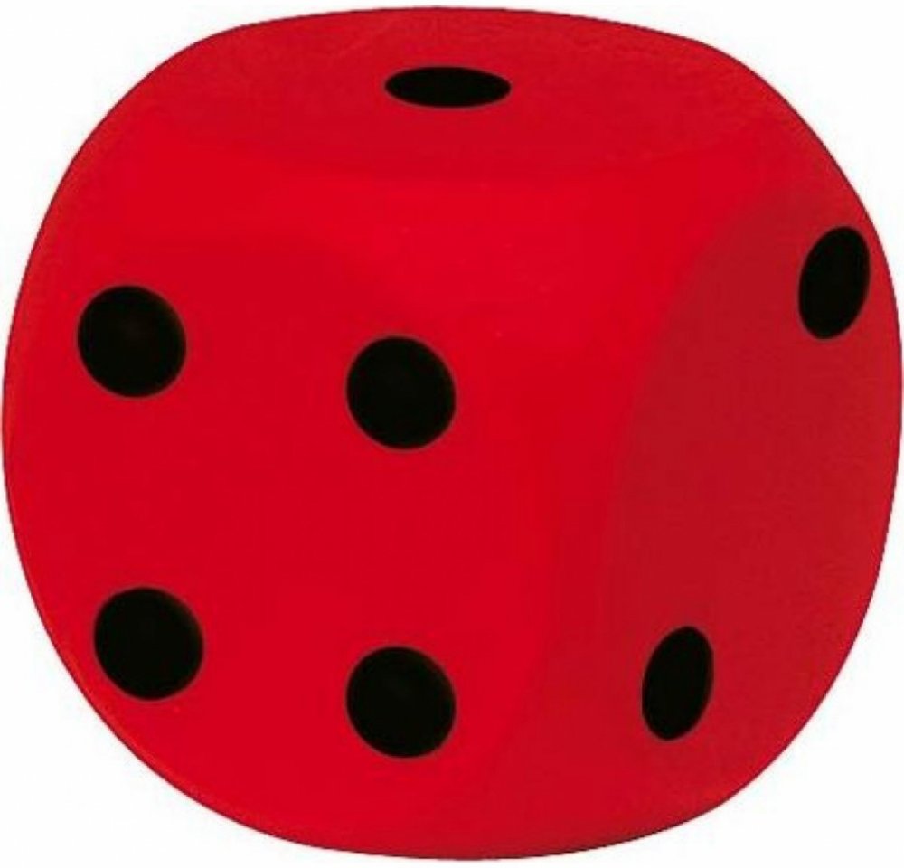 Dětská pěnová kostka v červeném provedení s černým značením je příhodná pro hraní na zemi. Je větších rozměrů než klasická malá kostka užívaná pro deskové hry.