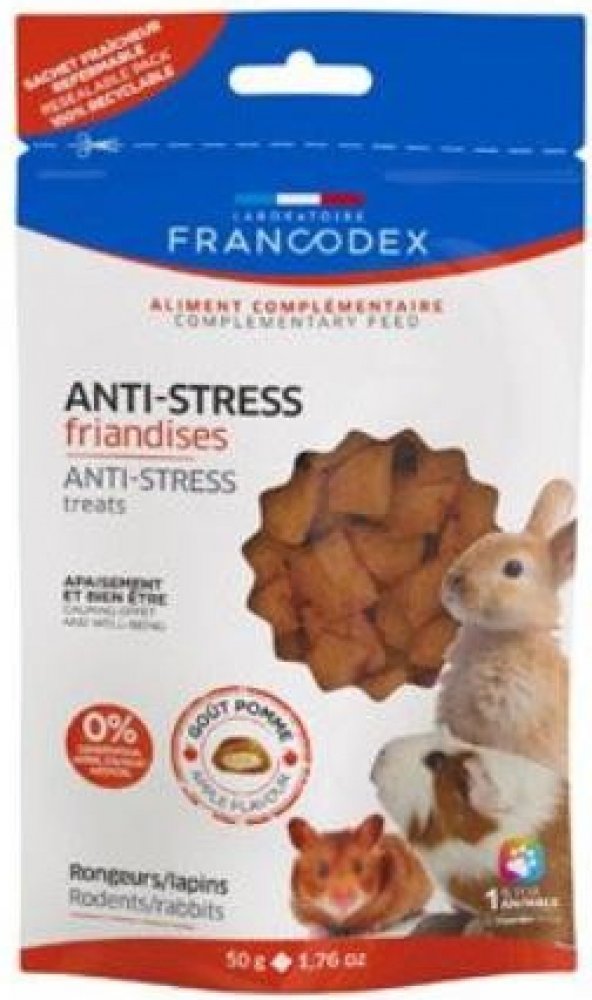 Francodex Pochoutka Anti-stress pro hlodavce 50g - Doplňkové krmivo pro hlodavce, křupavé na povrchu, tekuté uvnitř. - Městský život malých savců může být zdrojem stresu, pokud jde o adopci, přepravu, stěhování nebo příchod nového zvířete. Pochoutka FRANCODEX ANTI-STRESS obsahují vyváženou směs rostlin známých pro své relaxační a uklidňující vlastnosti.