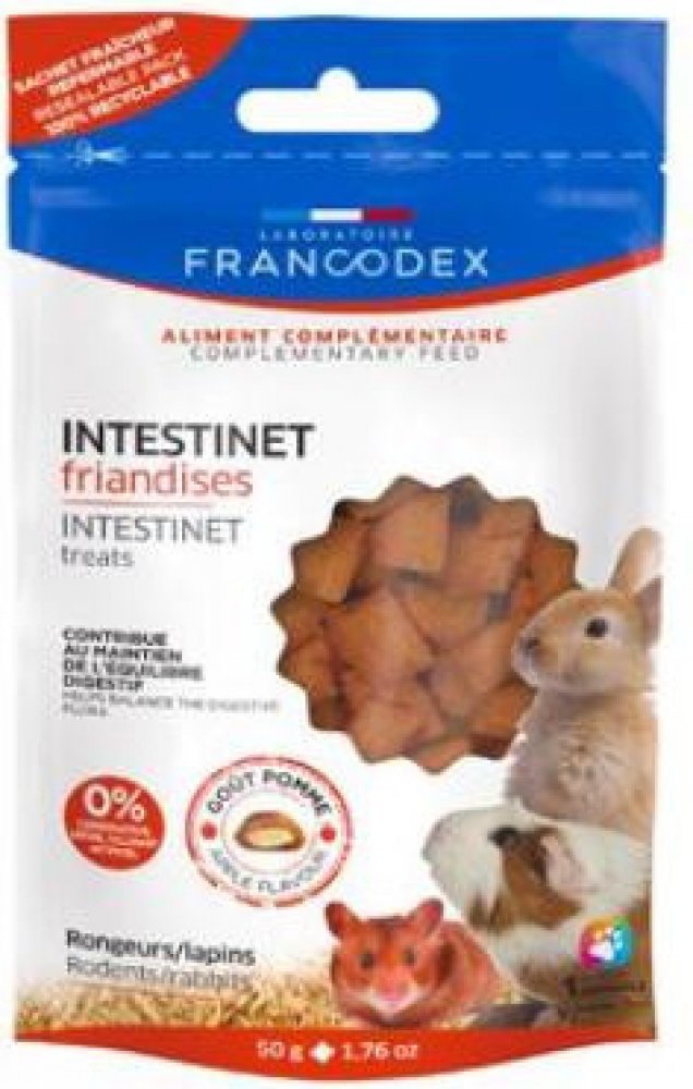Domácí hlodavci a králíci mají citlivá střeva. Stres a dietní nerovnováha mohou vést k pravidelným poruchám trávení. Lehce křupavé, FRANCODEX INTESTINET pochoutky obsahují prebiotika z řas, která podporují rozvoj vyvážené trávicí flóry, B glukany z pivovarských kvasnic známé svou rolí při podpoře trávicí imunity, esenciální mastné kyseliny omega-3 a omega-6 z řepkového oleje a také vitamíny. Složení: Obiloviny (slad 4,5 %), vedlejší produkt rostlinného původu (jetel 3,5 %, inulin 1 %), řepkový rostlinný olej, jablečný prášek 2 %, kvasnice 1 %, minerální látky, mouka z řas 0,5 %.Doplňkové látky (/kg): nutriční doplňkové látky: Vitamin E (RRR alfa tokoferylacetát 3a700) 113 mg, Vitamin A (3a672a) 2000 IU, Vitamin D3 300 IU, senzorické doplňkové látky: přírodní aroma, extrakt z rozmarýnu, technologické doplňkové látky: antioxidant . Analytické složky: Hrubé bílkoviny 8,55%, Hrubý tuk 22,2% (w3 mastné kyseliny: 0,96%, w6 mastné kyseliny: 2,4%), hrubý popel 1,65%, hrubá vláknina 2,96%, vlhkost 8,41%, vápník 0,15%, fosfor, 0,20% sodík 0,20 %. Doporučené dávkování:Králík: 2 až 4 pamlsky denně.Morče a pískomil: 2 pamlsky denně.Křeček a myš: 1 pochoutka denně.Krysa: 1 až 2 pamlsky denně.Před podáváním těchto pamlsků je nejlepší počkat, až jim bude 10 týdnů. Tato doplňková strava by neměla nahrazovat vyváženou stravu. Spotřebujte do jednoho měsíce od otevření. Podle potřeby zajistěte dostupnost čerstvé vody. Uchovávejte mimo dosah dětí. Uchovejte v chladu a suchu. Výrobek není určen k lidské spotřebě.