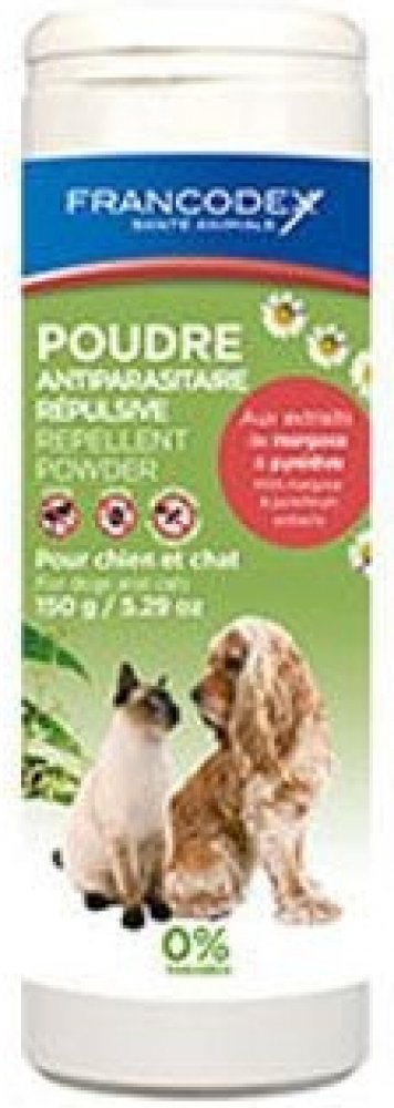 Pudr proti hmyzu od Francodex vyrobený z extraktu z margózy a pyrethra, přírodních odpuzovačů hmyzu, chrání proti jakémukoliv napadení parazity.