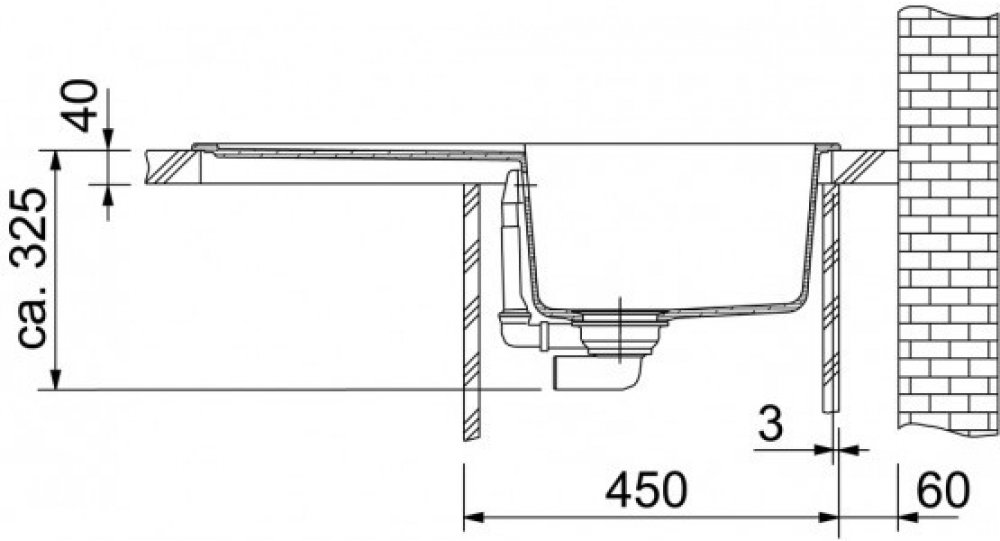 Důležité upozornění: Dřez je dodáván bez předvrtaných otvorů. Otvor pro baterii je nutné vytvořit při montáži. Baterie bude mírně nakloněna vzhledem k vyspádované odkapové ploše.