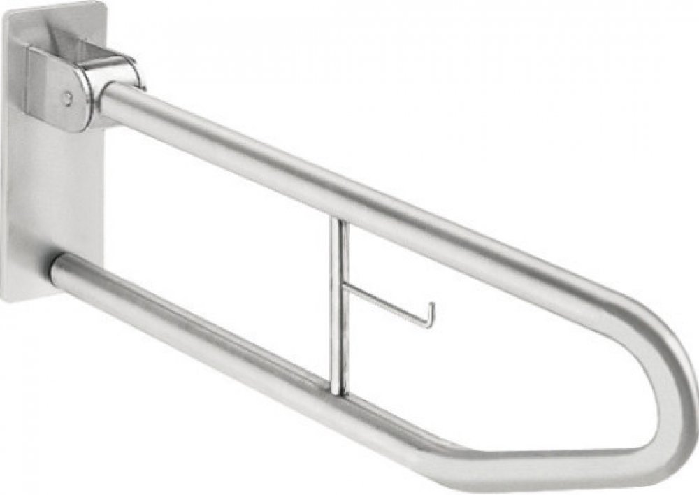 Nástěnné sklopné madlo s držákem toaletního papíruk montáži na omítku, chromniklová ocel, povrch hedvábně matný, broušenís protiskluzovým účinkem, tloušťka materiálu 1,2 mm, průměr trubky 32 mm, tvarzahnutý do U, s držákem toaletního papíru, ochrana proti nechtěnému sklopenídolů, gumový tlumič dorazu, testované a certifikované (LGA), montážní deskao tloušťce 4 mm se třemi upevňovacími otvory, včet...