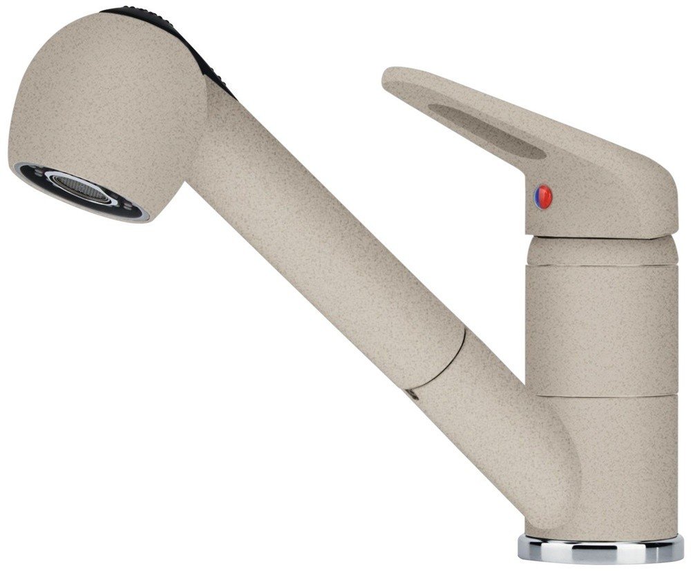 Franke FC 9547.082 NOVARA PLUS Sahara – kuchyňská baterie s otočným ramenem 120°, vytahovací sprchou a regulací režimu Sprcha / Proud, navržena pro pohodlné a flexibilní používání v kuchyni. Disponuje opletenou sprchovou hadicí délky 150 cm a připojovacími hadičkami dlouhými 45 cm. Průtok vody činí 10,3 l/min (při 3 bar).