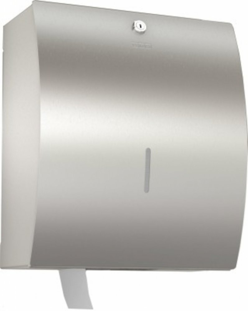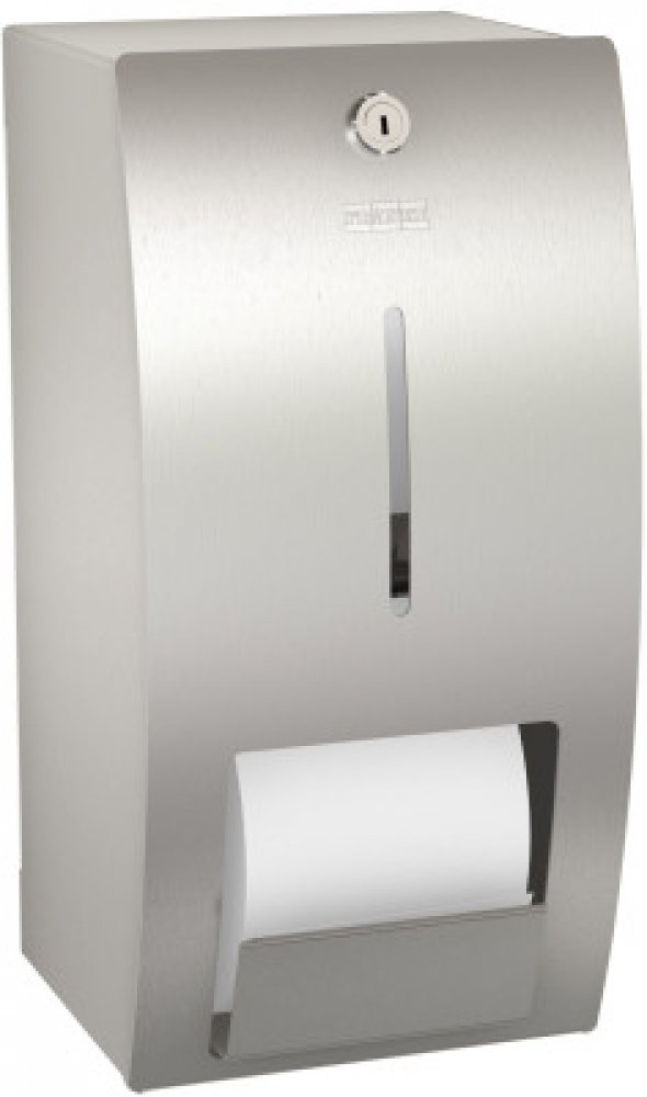 Dvojitý držák na role toaletního papíru k montáži na stěnu, nerezová ocel, povrch jemný matový, povrchová úprava předního panelu InoxPlus minimalizující otisky prstů a usnadňující údržbu (easy to clean), tloušťka materiálu 1,5 mm, zaoblený přední panel, vložkový zámek s univerzálním klíčem Franke, na dvě role o maximálním průměru 120 mm, druhá role se uvolní po spotřebování první role, bez hřídele...