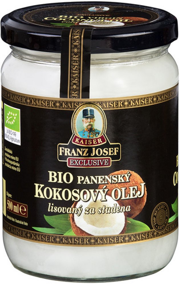 Franz Josef Kaiser Kokosový olej BIO panenský 500 ml. Jedlý rostlinný olej jednodruhový. Země původu: Srí Lanka Způsob zpracování: za studena lisované čerstvé kokosové ořechy, plody palmy kokosové (Cocos nucifera L.) vypěstované na srílanských biofarmách.