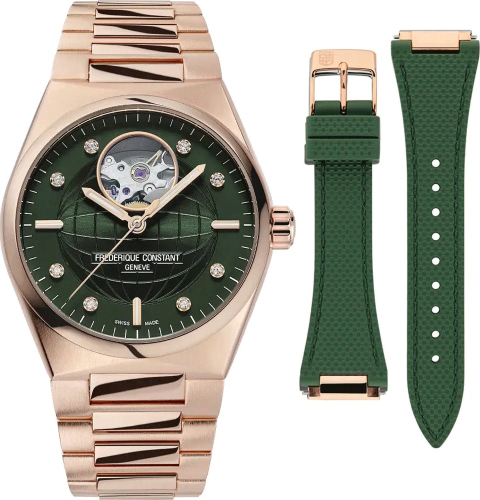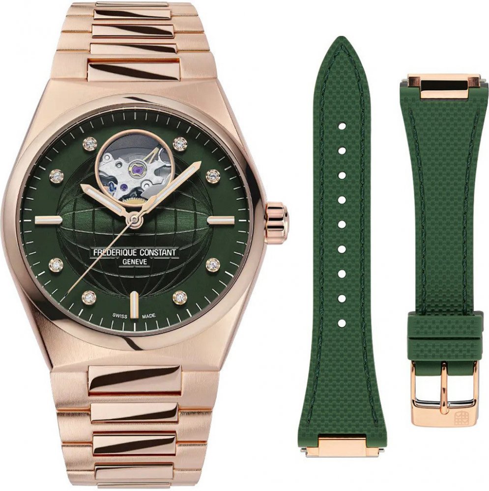 Frederique Constant Highlife Ladies Automatic Heart Beat FC-310MPGRD2NH4B jsou dámské automatické hodinky na integrovaném ocelovém náramku s PVD úpravou v barvě růžového zlata a motýlkovou sponou. Pouzdro z nerezové oceli ve stejné barvě má průměr 34 milimetrů, průhledné dýnko a signovanou korunku. Tyto univerzální hodinky v klasickém designu využijete pro každodenní nošení. Tmavě zelený číselník s motivem zeměkoule zdobený 8 diamanty o hmotnosti 0,04 ct je chráněn odolným safírovým sklem a upoutá pozornost průhledem na samotné srdce strojku (setrvačku). Aplikované hodinové indexy jsou společně s ručkami pokryty luminiscenčním nátěrem Super-LumiNova®, který garantuje perfektní čitelnost za zhoršených světelných podmínek. Pohon hodinek zajišťuje mechanický strojek FC-310 s automatickým nátahem a rezervou chodu přibližně 38 hodin. Základem kalibru je Sellita SW200. Tento strojek s funkcí hackingu lze v případě potřeby natahovat i ručně pomocí korunky. Vodotěsnost hodinek činí 5 ATM a jsou tedy odolné proti dešti a při sprchování. Součástí balení je náhradní pryžový řemínek zelené barvy.