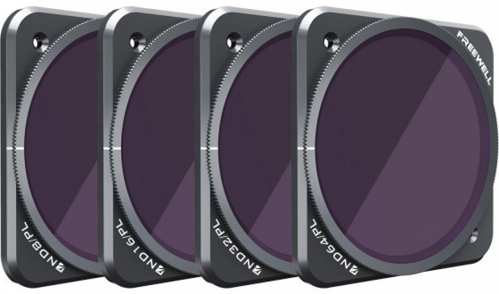 Sada čtyř filtrů Freewell pro akční kameru DJI Action 2. Sada obsahuje filtry ND8/PL, ND16/PL, ND32/PL, ND64/PL.
