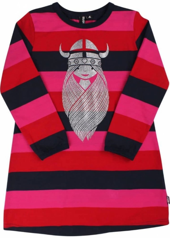 Dětské šaty s dlouhým rukávem a válečnicí Frejou. Tyto proužkované dívčí šaty v odstínech růžové a červené barvy budou praktickým kouskem v šatníku Vaší malé slečny. Barva, tvar i potisk zůstanou stále krásné i po opakovaném praní. Šaty byly navrženy tak, aby poskytovaly pohodlí a nepřekážely dítěti při hře a pohybu.
