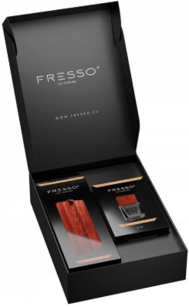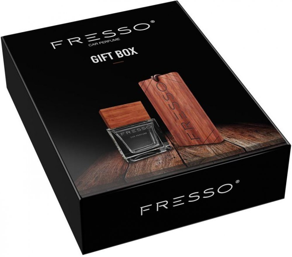 Fresso Gift Box je ideálním dárkem pro každého, kdo miluje vůni a eleganci. Obsahuje dřevěnou závěsku a 50 ml parfém do auta.