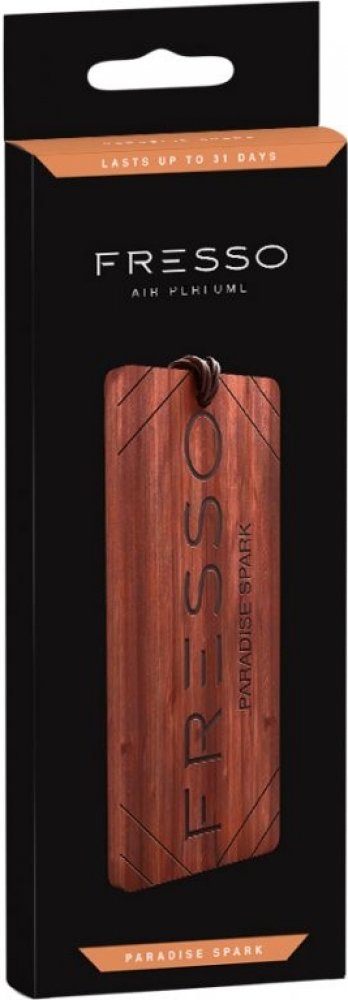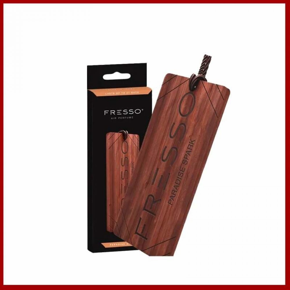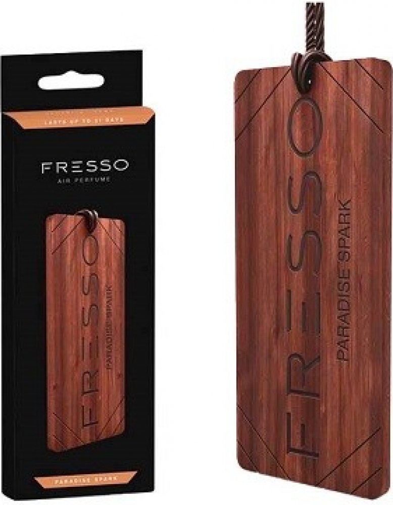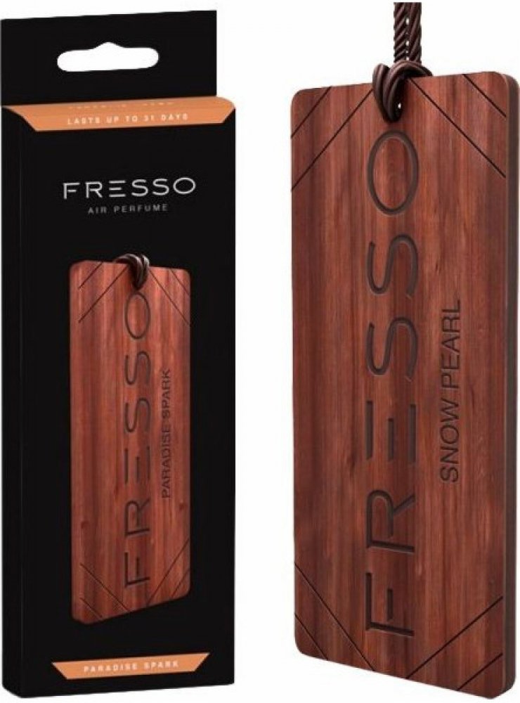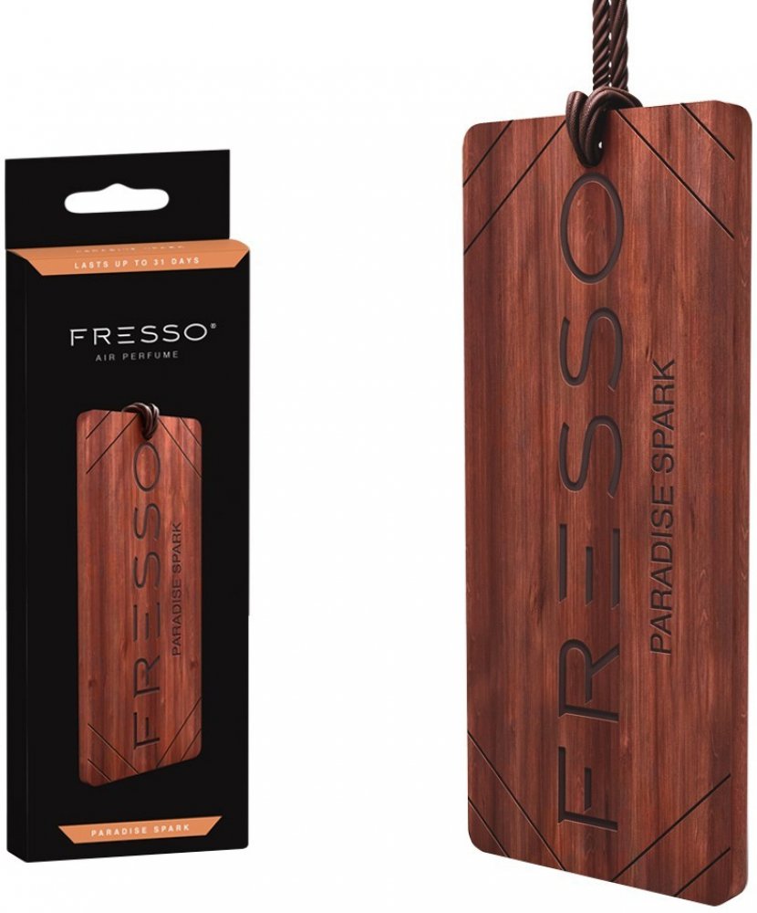 Dřevěný přívěsek Fresso s vůní "Paradise Spark" Elegantní dřevěný přívěsek s vůní "Paradise Spark", který se dá pověsit za koženou pletenou šňůrku na zpětné zrcátko v autě. Jedná se o sofistikované příslušenství, které dokonale ladí s jakýmkoliv interiérem vozu. Přívěsek Fresso vás překvapí svojí vyjímečnou podobou a vůní, která je trvanlivá a důmyslně složená. Vzhledem k přírodnímu původu se přívěsky mírně liší vzhledem a zároveň vytvářejí výjimečnou atmosféru ve vašem autě. Jedinečný recept vůní Fresso je založen na hodnotných složkách, které jsou geniálně sestaveny. Tato vůně pak dokáže vonět až 31 dnů. Jemné vonné tóny Fresso se uvolňují průběžně a kontrolovaně. Nehrozí žádná přehnaně intenzivní vůně, která je mnohdy ze začátku až obtěžující, jak tomu často bývá u ostatních vůní do auta. Vůně zůstává stabilní téměř po celou dobu použití přívěsku. Rozměry přívěsku jsou 115 x 50 mm. Vůně Fresso "Paradise Spark" Vůně "Paradise Spark" je kombinací lehké ovocné vůně s vůní rozkvetlé přírody. Pečlivě zvolené vonné složky jsou zárukou příjemné a nevtíravé vůně. Aromatická směs s tóny citronu a bergamotu, jarní zeleň s tóny posekané trávy a křupavého jablka. Nádherná jemnost konvalinky se stává stále výraznější a vytváří útočiště z jantaru a dubového mechu. Každý den se můžete obklopit vůní, která vyzařuje pozitivní energii.