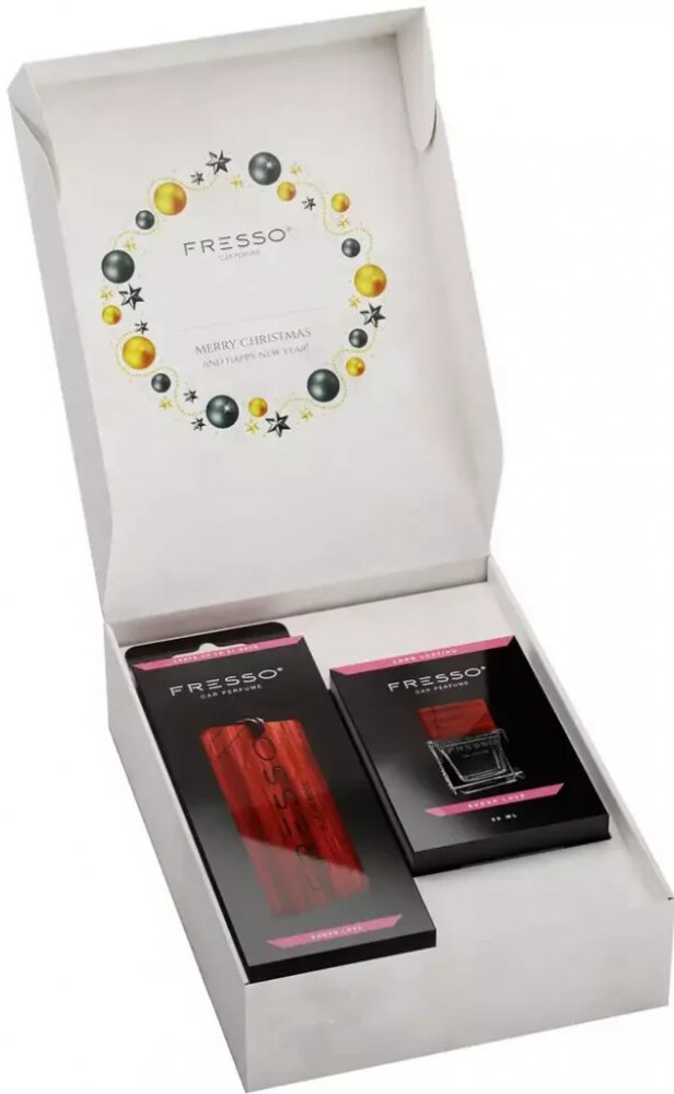 1x dárková krabička Fresso Christmas Box1x závěsná vůně Fresso Sugar Love Hanger1x vůně v rozprachu Fresso Sugar Love Perfume (50 ml)