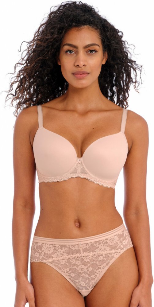 Podprsenka Freya Offbeat je tzv. "demi plunge" model, který má střed podprsenky vyšší, ale stále drží poprsí krásně u sebe a vytváří tak plný dekolt. Vyšší střed zároveň krásně podpoří také méně pevné poprsí. Díky hladkému tvarovanému košíčku se podprsenka nebude rýsovat pod oblečením. Obvod je v přední části zdobený jemnou krajkou. Ramínka jsou hladká a délkově nastavitelná. Střed podprsenky zdobí decentní saténová stuha s jemným kovovým detailem. Tento model je univerzálním kouskem, který je praktický a zároveň skvěle vypadá. V tělové barvě je podprsenka ideální pod světlé oděvy.