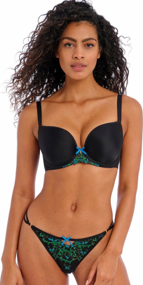 Ikonický střih plunge Freya Deco v novém kabátku pod názvem Freya Show Off. Tento střih je ideální do hlubokého výstřihu a krásně podpoří i větší poprsí. Menší prsa moc hezky vytvaruje a posune na střed. Nízký střed podprsenky a do hladka tvarované košíčky posouvají poprsí více k sobě a vytvářejí plný dekolt. Ramínka jsou hladká a délkově nastavitelná, na zádech je lze sepnout do kříže. V černé barvě v kombinaci se zeleno-modrou květinovou výšivkou ve středu přední části působí podprsenka velmi elegantně a netradičně. Doporučujeme kombinovat s kalhotkami ve stejném designu a vytvořit tak krásný komplet.