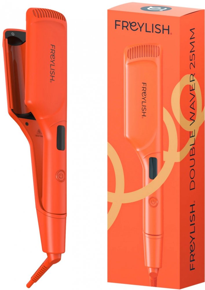 Elegantní dvojkulma Freylish® pro přirozené střední vlny umožňuje rychlý a šetrný styling bez poškození vlasů. Dvojitý keramický válec rozkládá teplo rovnoměrně, čímž vytváří hladké, lesklé a dlouhotrvající vlny. Lehká konstrukce a otočný kabel zajišťují pohodlné používání doma i v salonu.