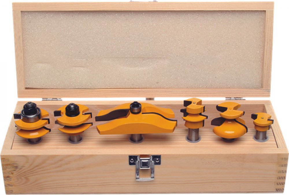 Kompletní sada nástrojů – výplňová fréza, fréza na profil a spoj rámu, fréza na hrany zásuvek, fréza na ozuby (např. pro přípravu spárovkových desek výplní) a fréza na spoj zásuvek (např. pro připojení čela zásuvky ke korpusu). Vše se stopkou 12 mm v dřevěné kazetě.