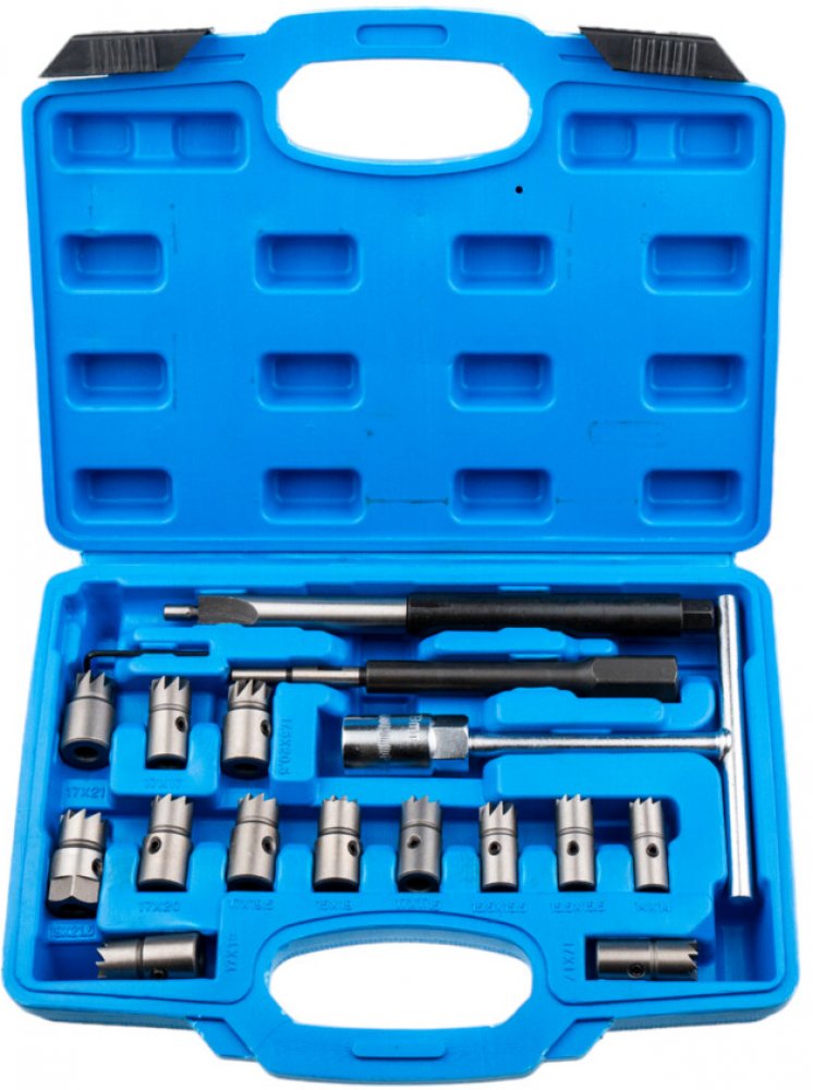 Frézovací sada na vyčištění a srovnání sedel dieselových vstřikovačů, 17 kusů v plastovém kufříku – SATRA S-XDI17 Určeno pro očištění sedla od nečistot a srovnání jeho povrchu před usazením nového „vstřiku“. Určeno pro většin běžných motorů ve vozidlech na našich silnicích (obzvlášť po roce výroby 2000). Obsah: - 1x pilot - 1x T-rukojeť - 1x prodloužená fréza 15.5 x 225 mm - 1x Imbus 5 mm 3x úhlová frézka (výstružník): 15.5 x 15.5 mm – 17 x 17 mm – 17 x 21 mm 10x rovná frézka (výstružník): 14 x 14 mm – 15 x 15 mm – 15 x 19 mm – 17 x 17 mm – 17 x 17.5 mm – 17 x 19 mm – 17x 19.5 mm – 17 x 20 mm – 17.5 x 20.5 mm – 19 x 21.5 mm